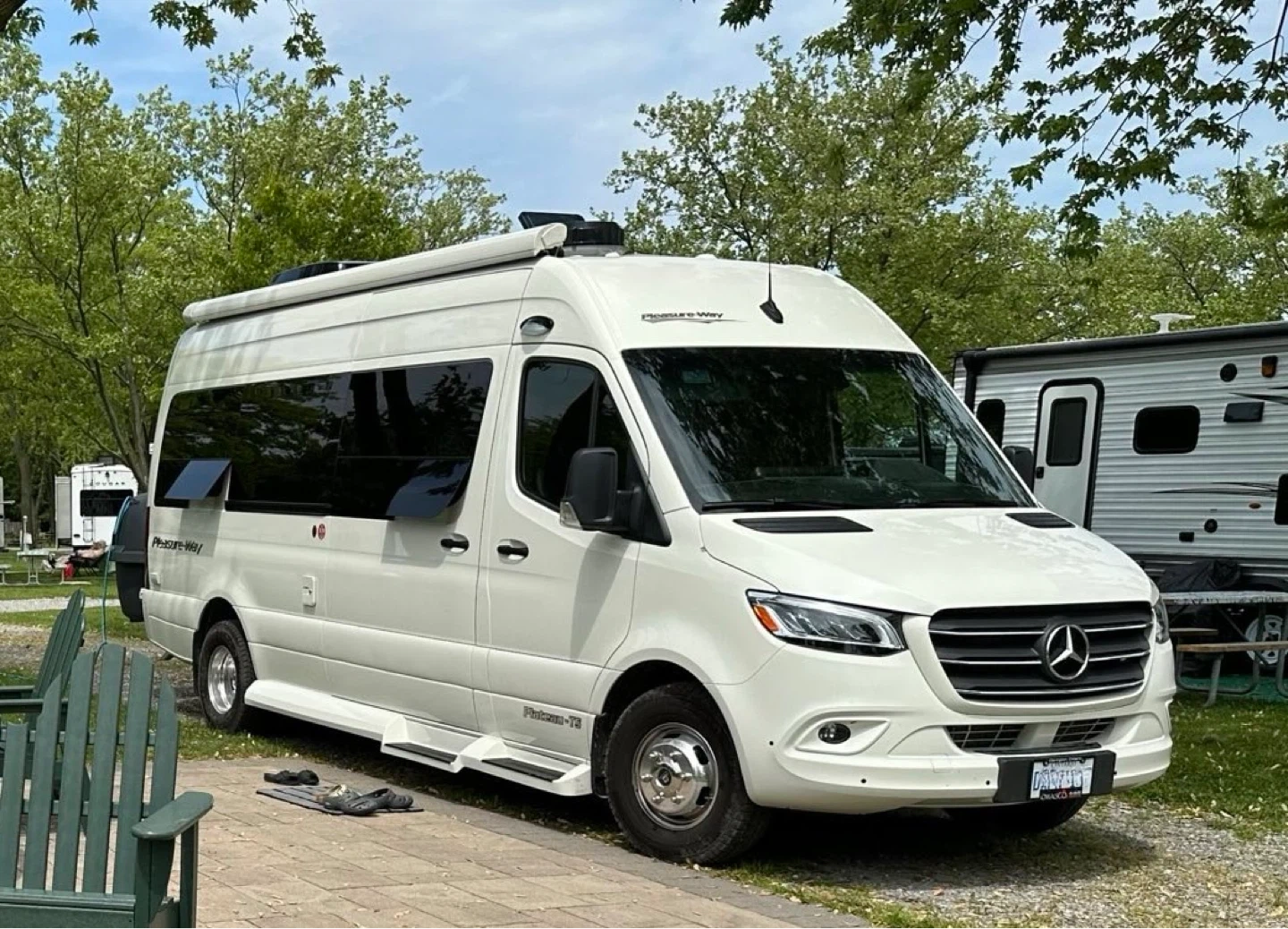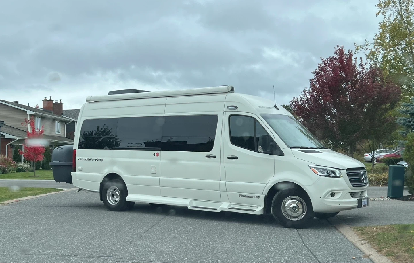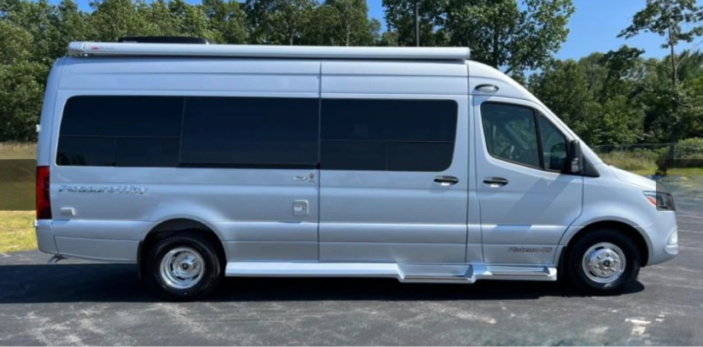 The 2024 Mercedes-Benz Pleasure-Way Plateau TS is a luxury Class B motorhome with tinted windows and an awning.