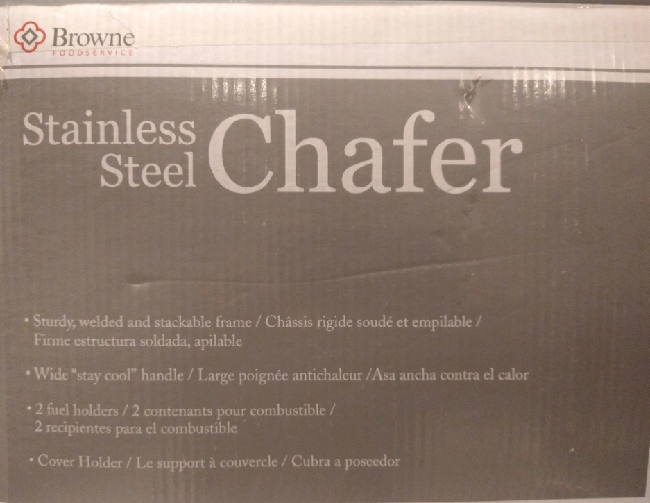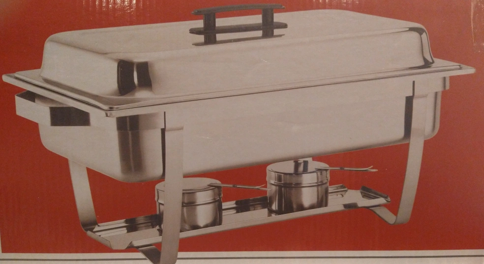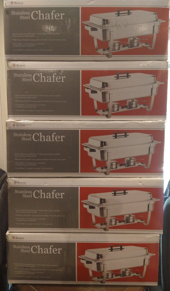A metal chafing dishes with a lid. Five in total. The item is supported by a stand, complete with fuel holders. This chafer can enhance any meal you prepare. $35 each. Very good condition. In original boxes.