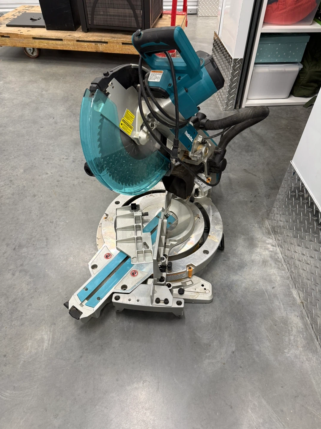 Used Makita compound miter saw. It's a powerful tool for making precise cuts. Features include a laser guide for accuracy.
