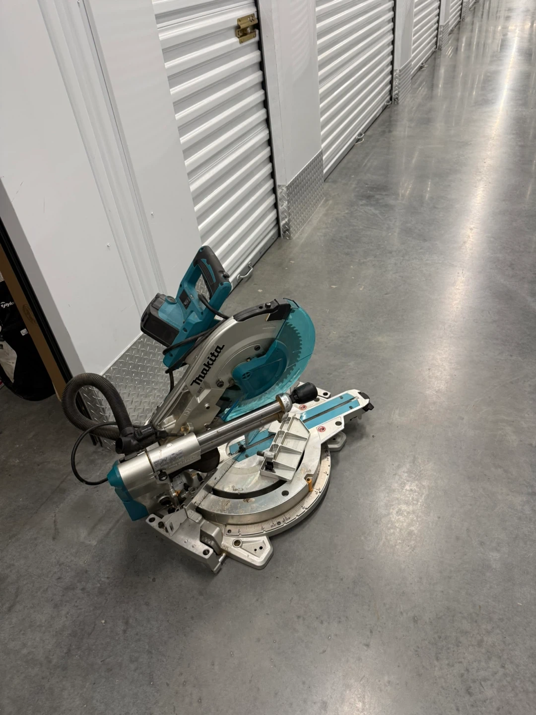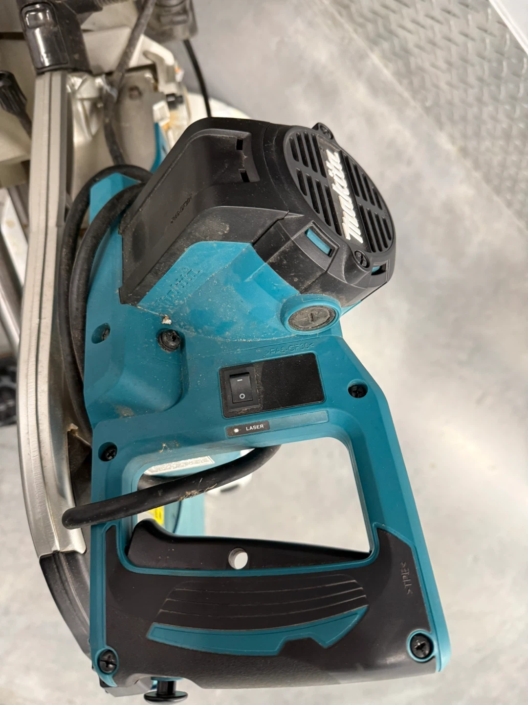 Used Makita compound miter saw. It's a powerful tool for making precise cuts. Features include a laser guide for accuracy.