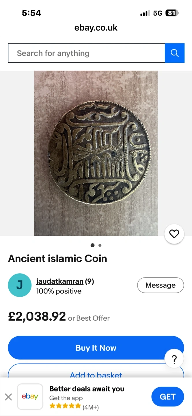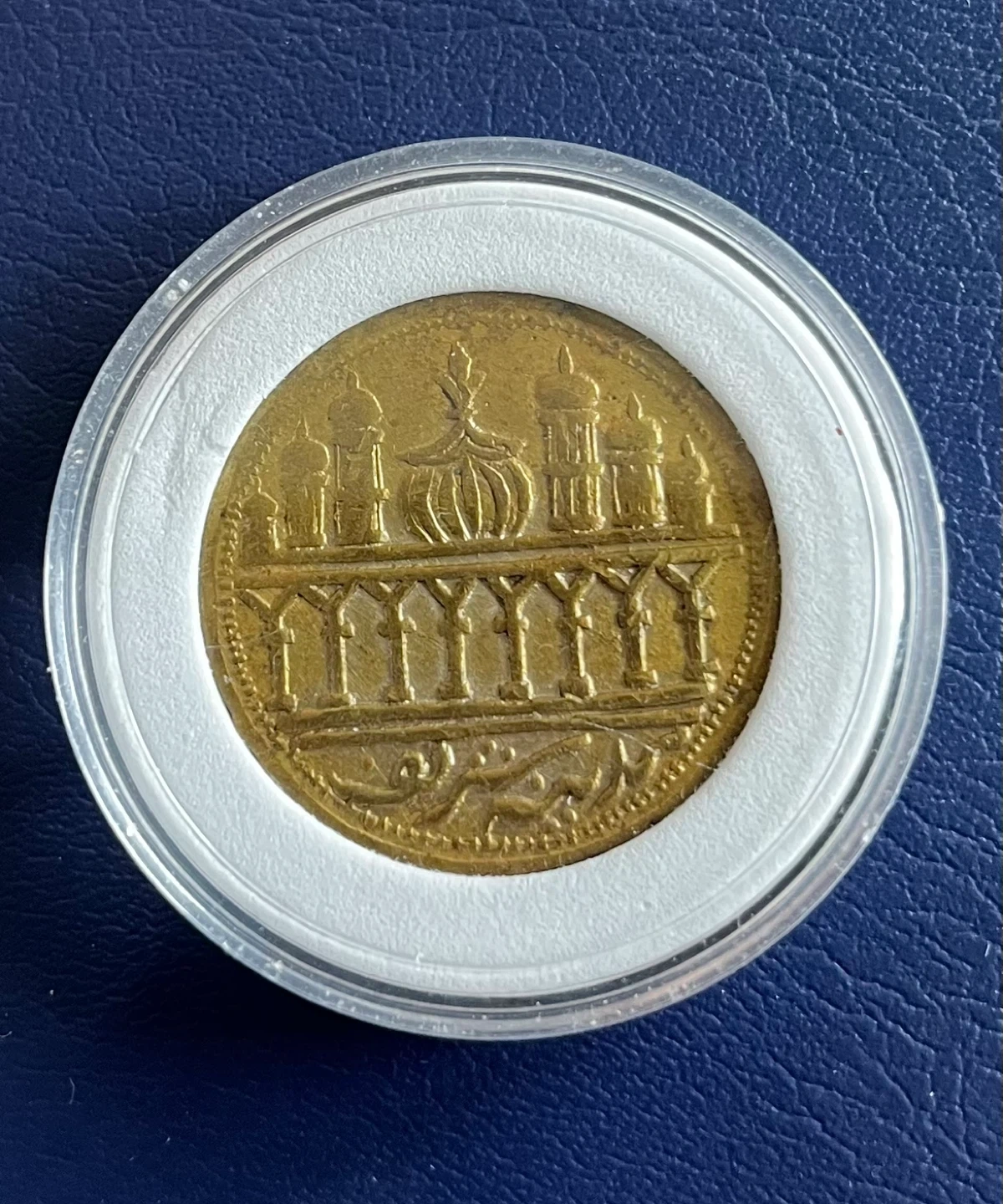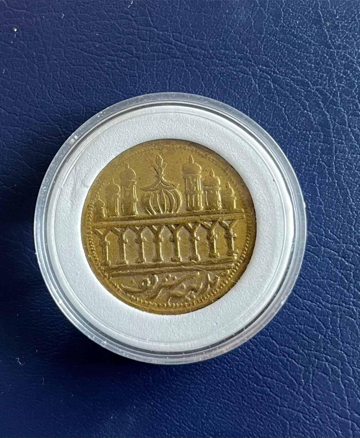 This is an ancient Islamic coin with intricate calligraphy on one side and an architectural design on the other. It's housed in a protective plastic case. This coin would be of interest to collectors of historical artefacts.