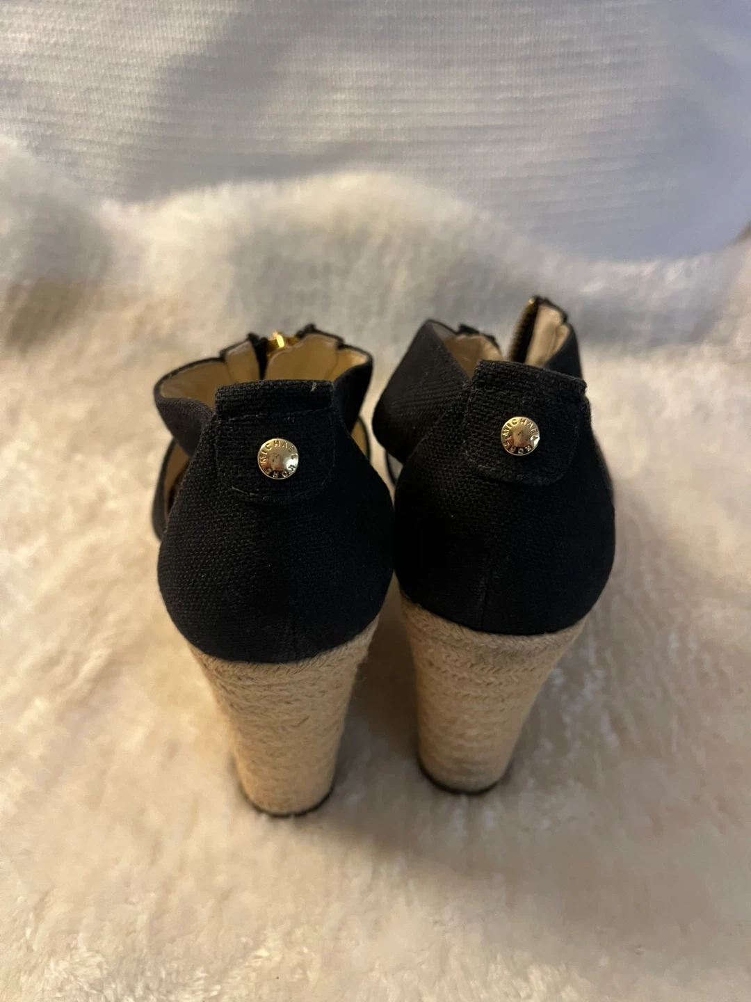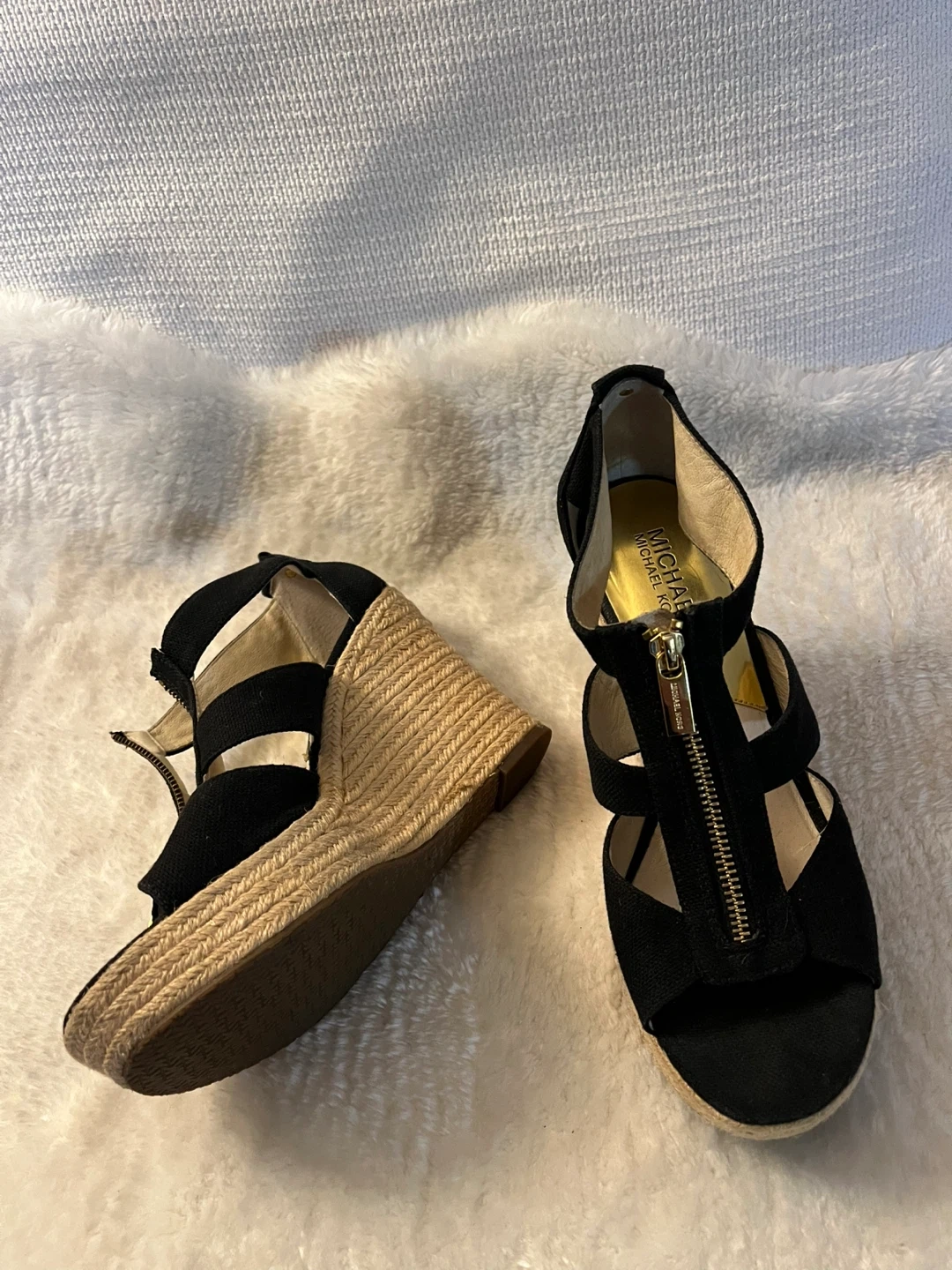 Michael Kors black wedge espadrille leather sandals with a front zipper, canvas upper and a woven espadrille sole