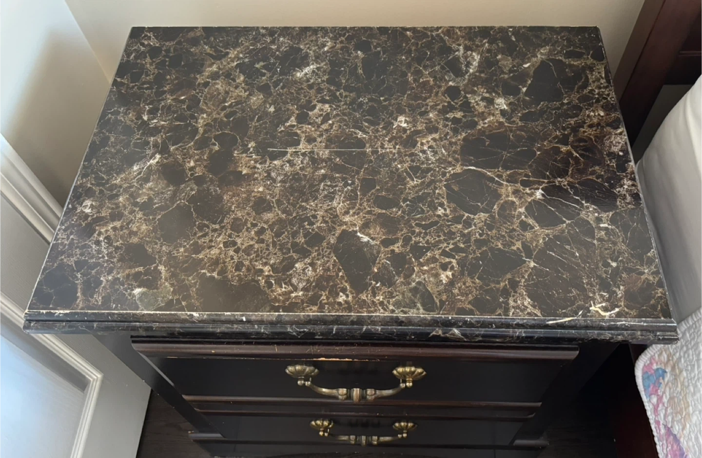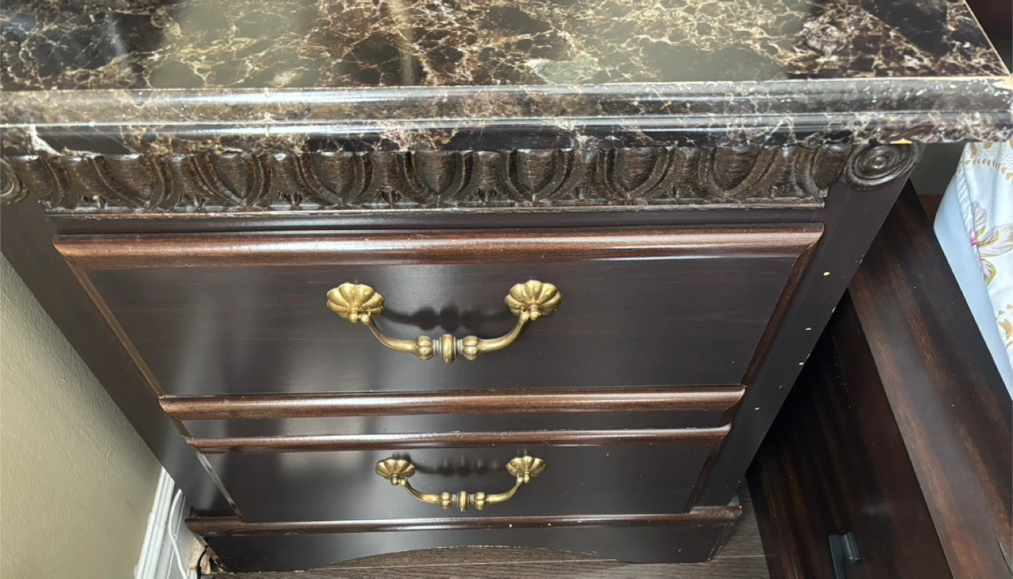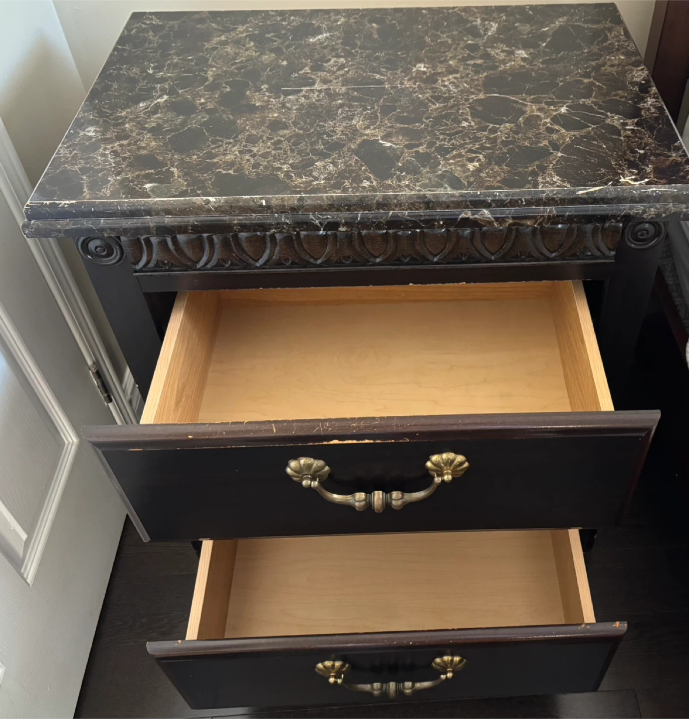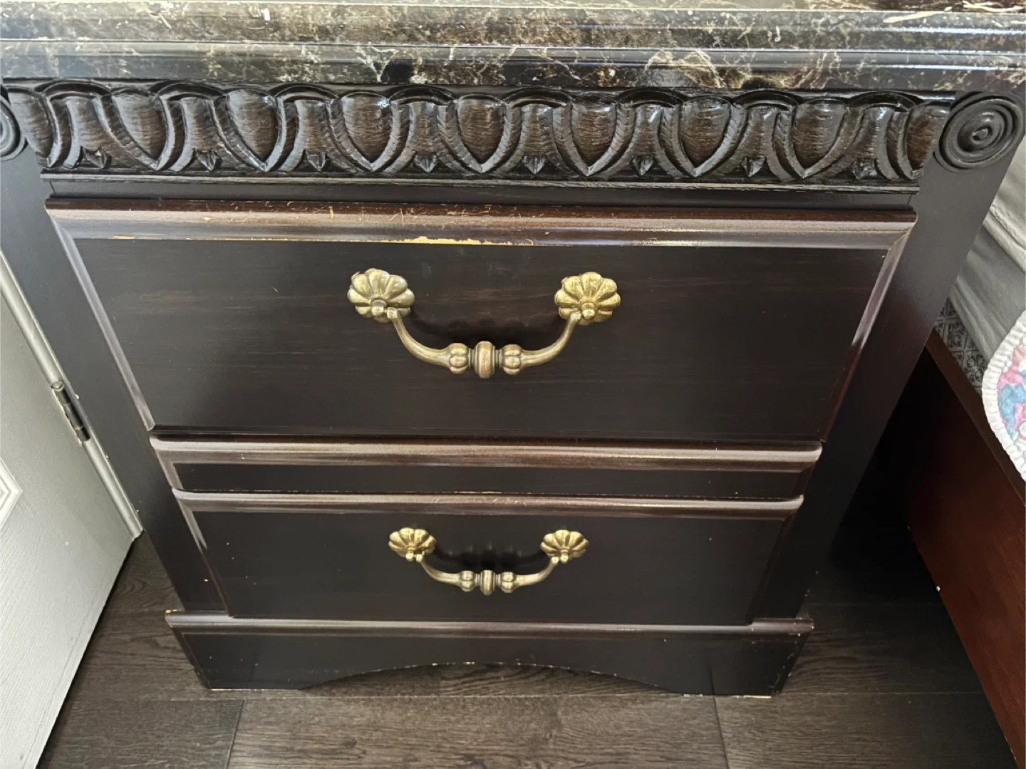 $45 for 2 brown nightstands It features two drawers with ornate gold-coloured handles. There are some signs of use, including minor scratches and wear on the finish, but it's still a functional and stylish piece for your bedroom!