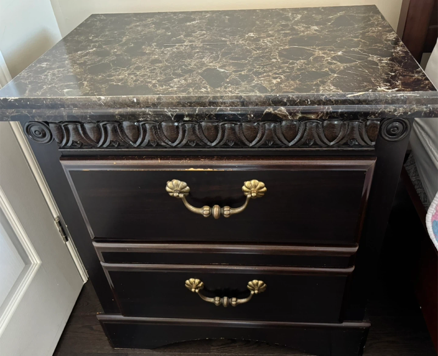 $45 for 2 brown nightstands It features two drawers with ornate gold-coloured handles. There are some signs of use, including minor scratches and wear on the finish, but it's still a functional and stylish piece for your bedroom!
