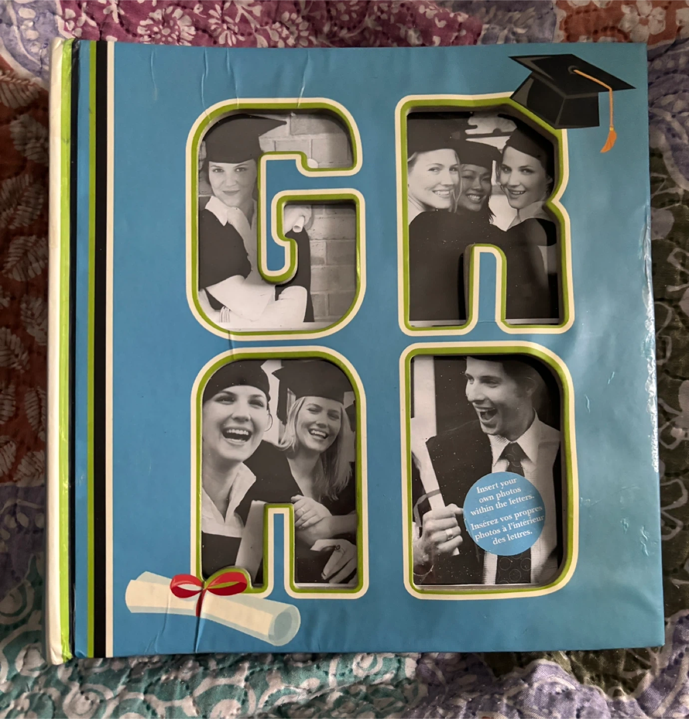 Display your graduation memories in this blue photo frame. It spells out "GRAD" with photo openings. Made in China.
