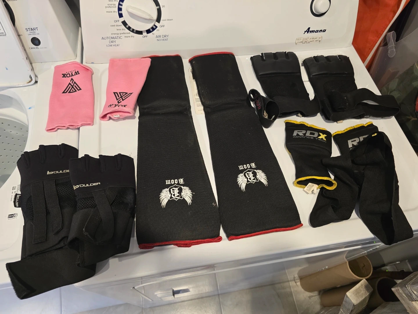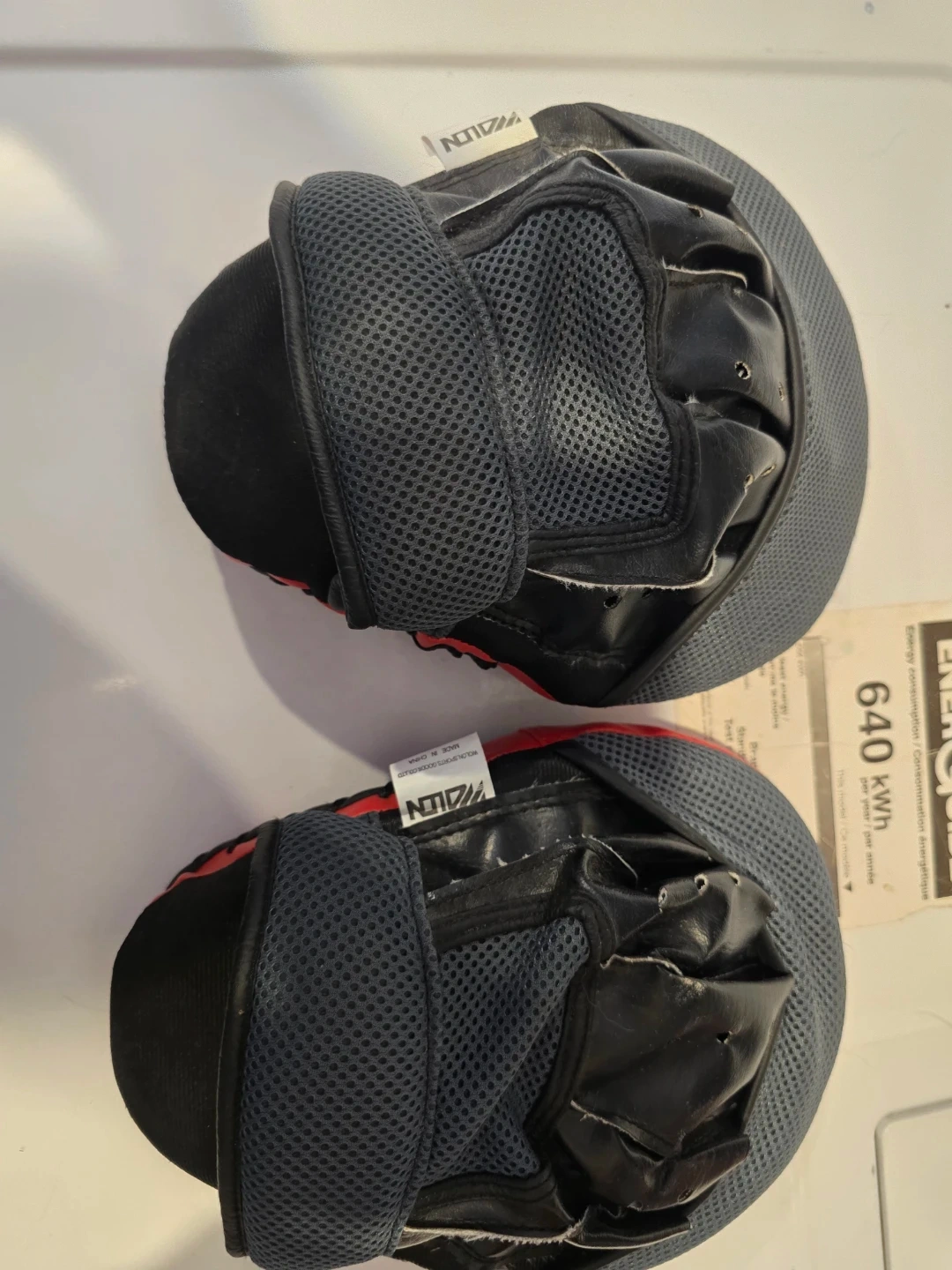 Used WOLON boxing mitts. These mitts are black with red trim and a mesh interior for breathability. They feature adjustable straps for a secure fit. Great for training!