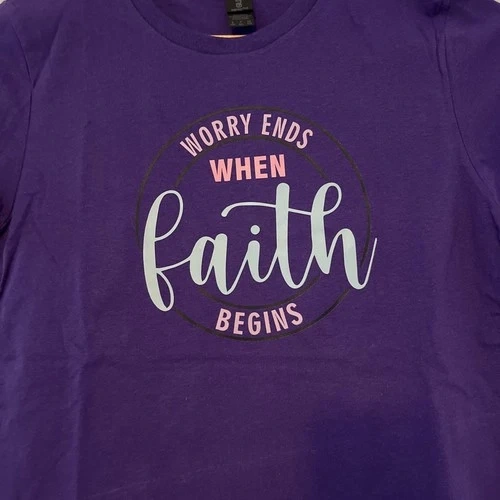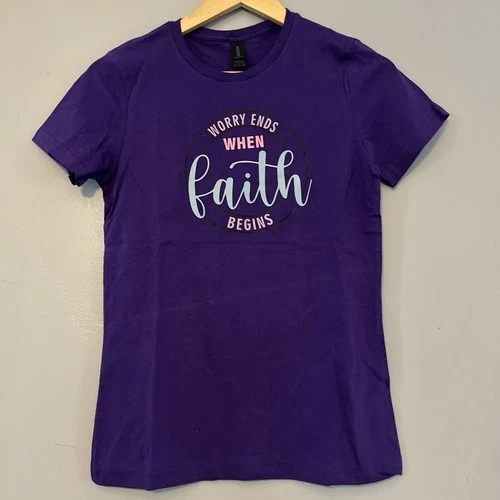 Women's short sleeve t-shirt in purple, size small. Features the message "Worry Ends When faith begins." A comfortable and stylish top for those who like faith-based designs.