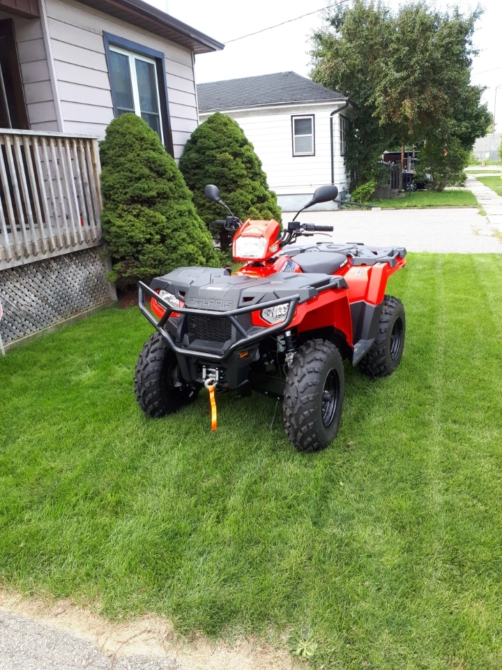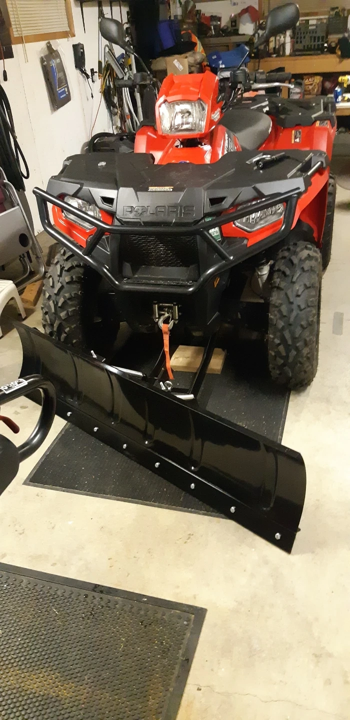 Red Polaris Sportsman 570ATV. Powerful engine and durable design. Includes a front plow attachment for winter use!
