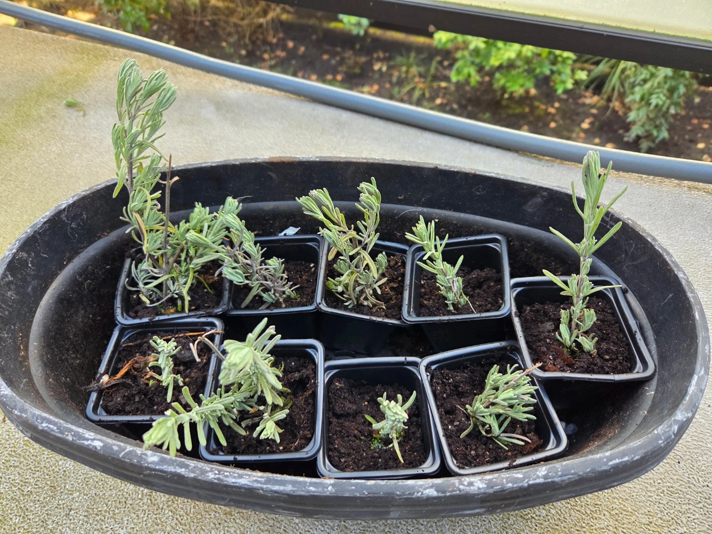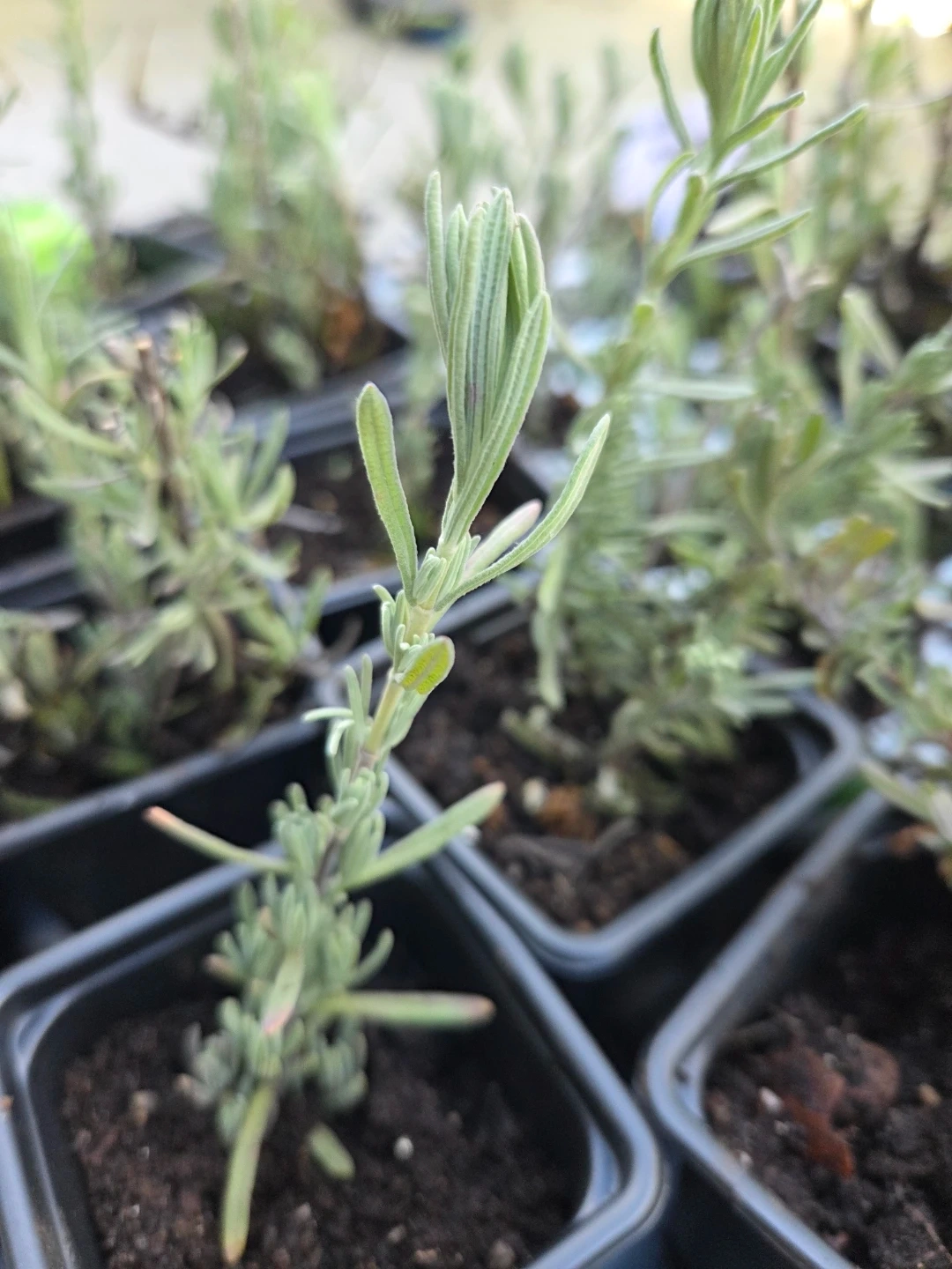 Nine lavender plant seedlings are ready for a new home. These young plants are in individual small pots. They're perfect for starting your own herb garden or for adding a fragrant touch to your outdoor space. Give them some sun and they'll grow beautifully! Naturally keeps away ants and pests!!