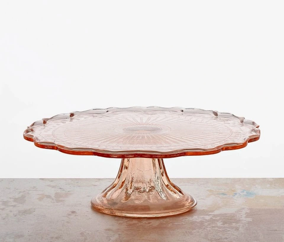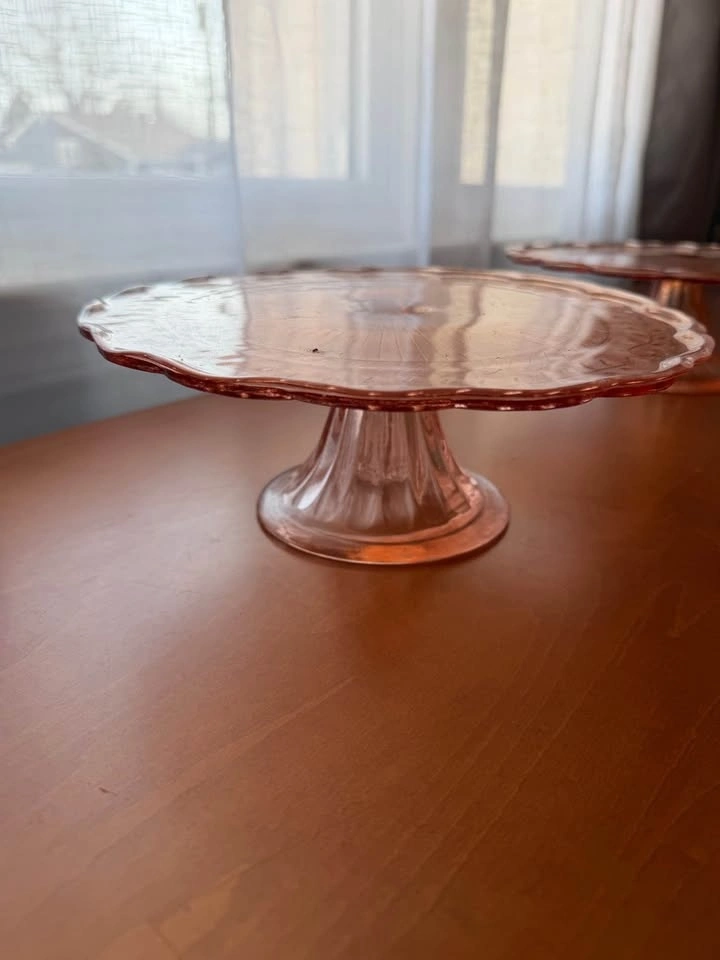 Everyday is coming up roses with this beautiful rosy pink set of vintage 40's depression glass Fostoria Fairfax Pink dessert/bread & butter side plates and a lovely scalloped edge Maison Pink pedestal cake stand adorned with etchings and a sweet leafy vine pattern. Serving your favorite cakes and desserts just got next level with this colorful set and re-loving vintage finds. Take the pair for $40 or $20 each.
