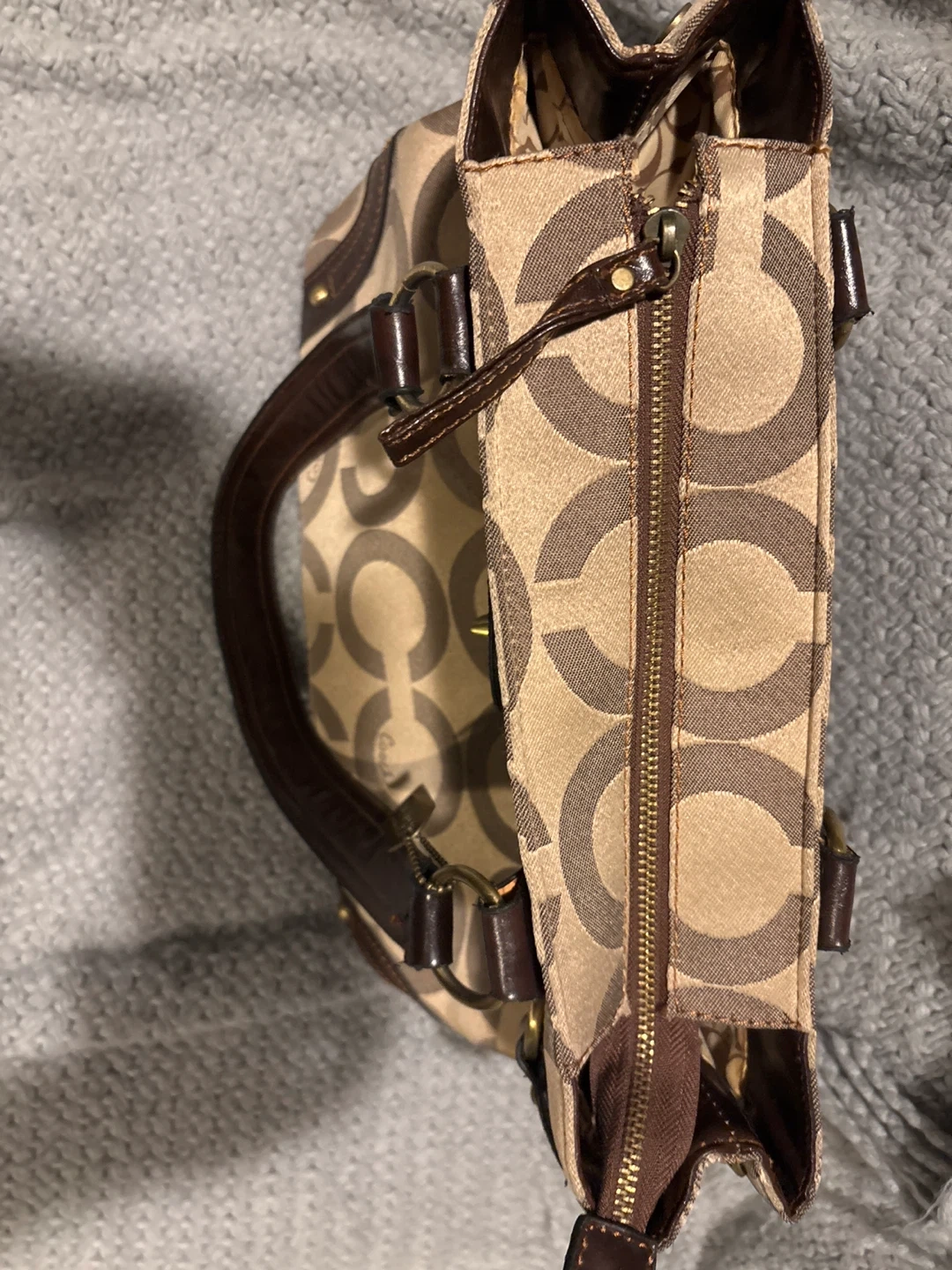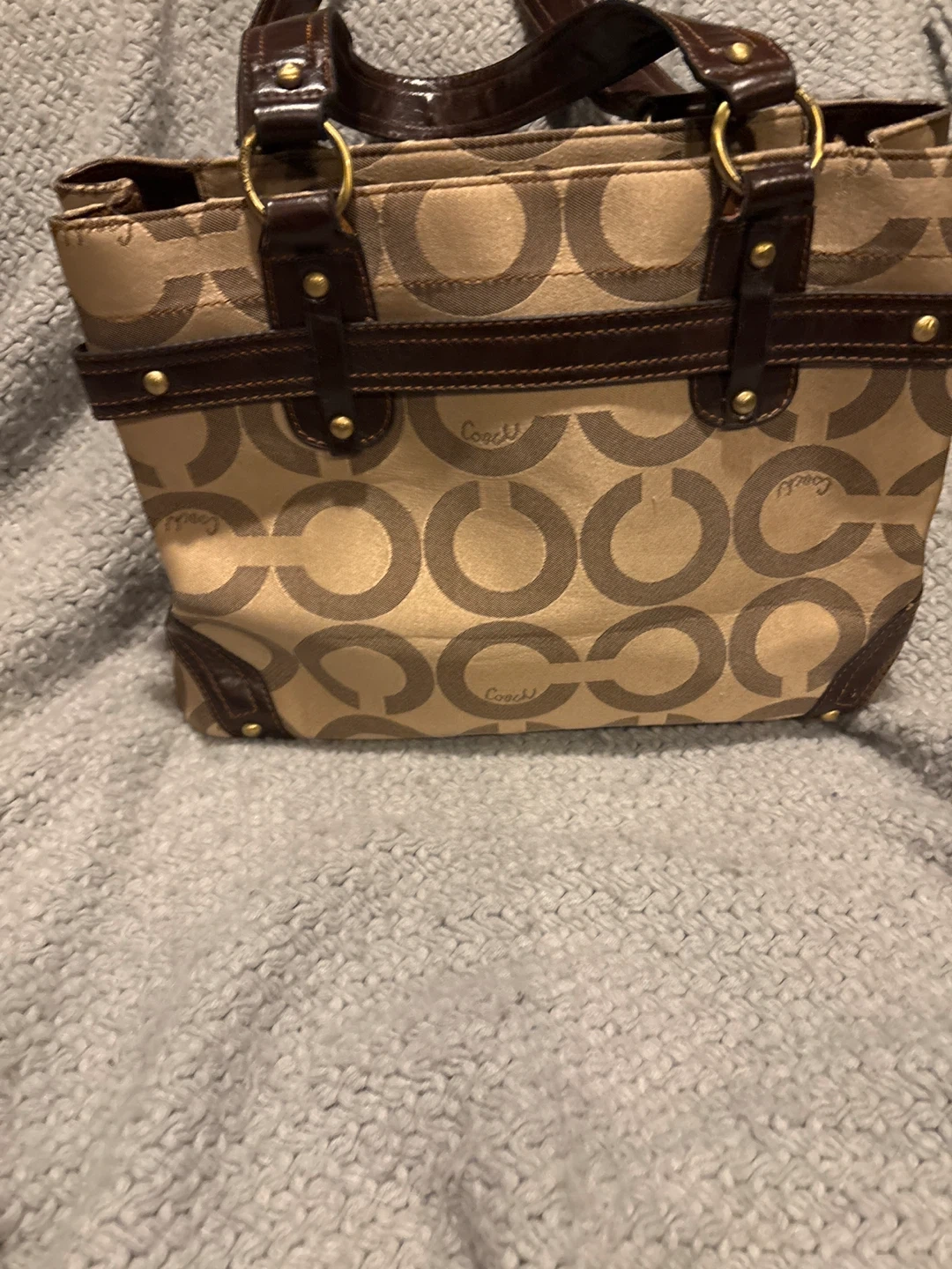 This is a classic Coach tote bag featuring the signature C monogram pattern. It's made with a durable canvas and leather trim. Great for everyday use, it holds essentials with style.