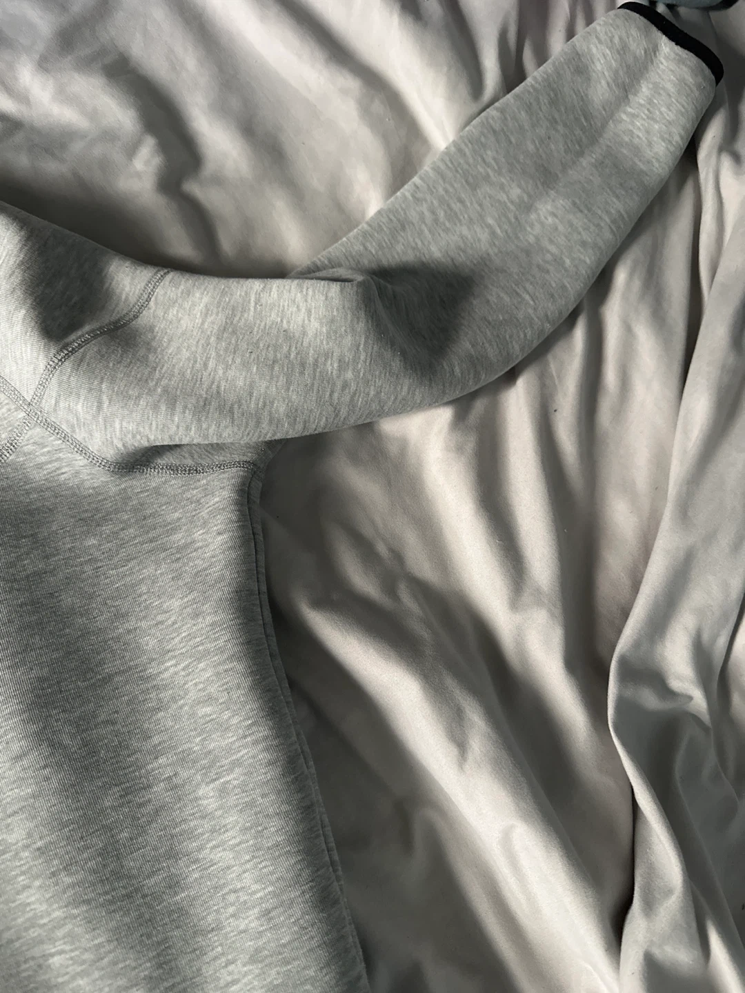 Grey Nike Tech Fleece zip-up hoodie. It's made with a blend of cotton and polyester. Features zippered pockets on both sides.