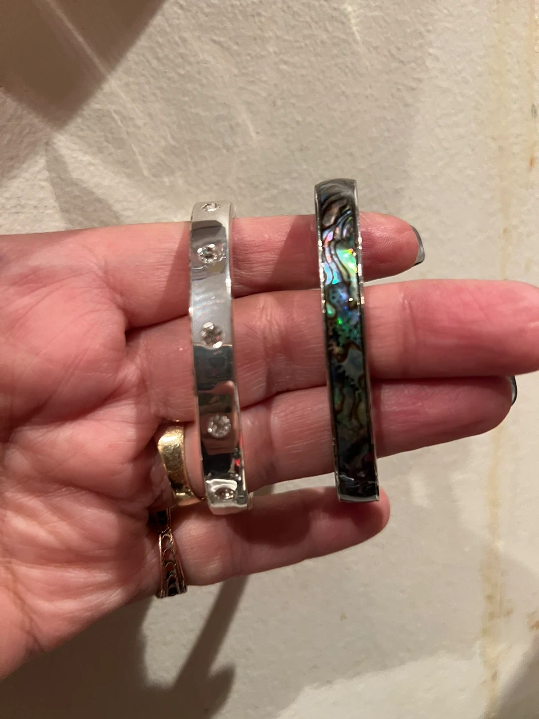 Two stylish bracelets. One is silver-tone with small clear gems. The other features a beautiful abalone inlay with iridescent colours. They're great for adding a touch of flair to any outfit! $15 each or both for $25