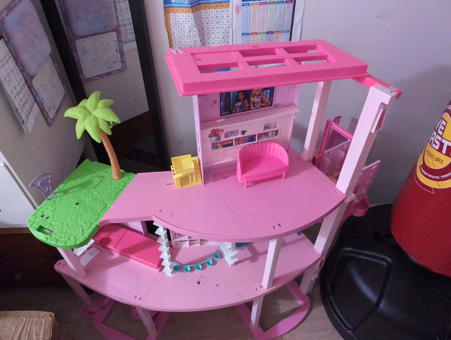 This Barbie Dreamhouse playset is made of pink plastic. It features multiple levels, balconies, and accessories like a tiny chair and piano. It's perfect for imaginative play!
