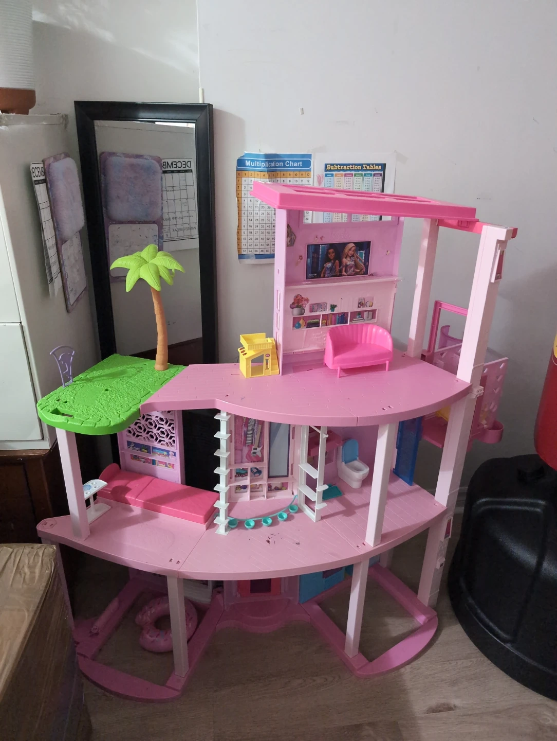 This Barbie Dreamhouse playset is made of pink plastic. It features multiple levels, balconies, and accessories like a tiny chair and piano. It's perfect for imaginative play!