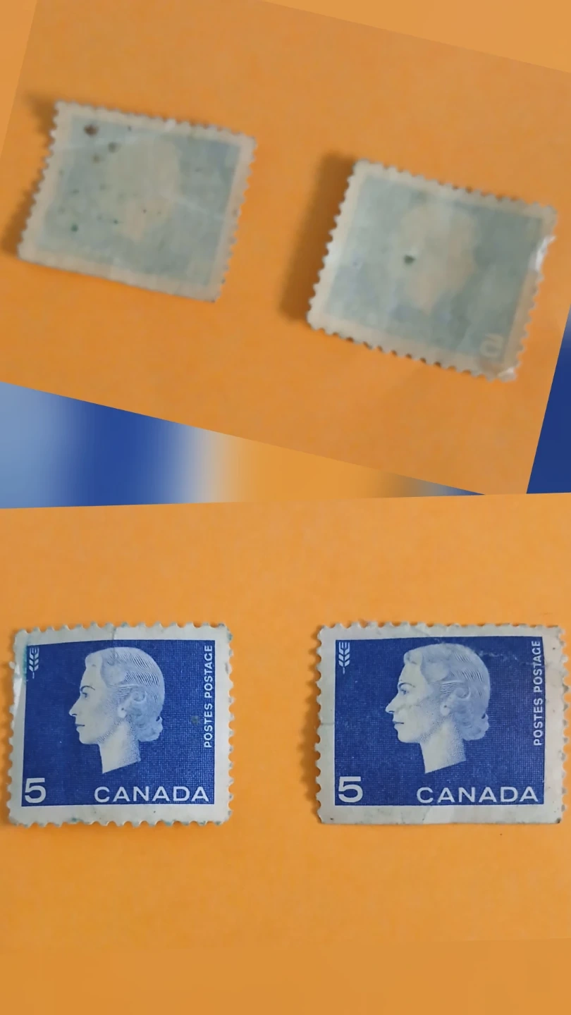 Two Canadian 5 cent postage stamps featuring Queen Elizabeth II. These are part of a stamp collection. The stamps appear to be from the 1960s. Perfect for stamp collectors!