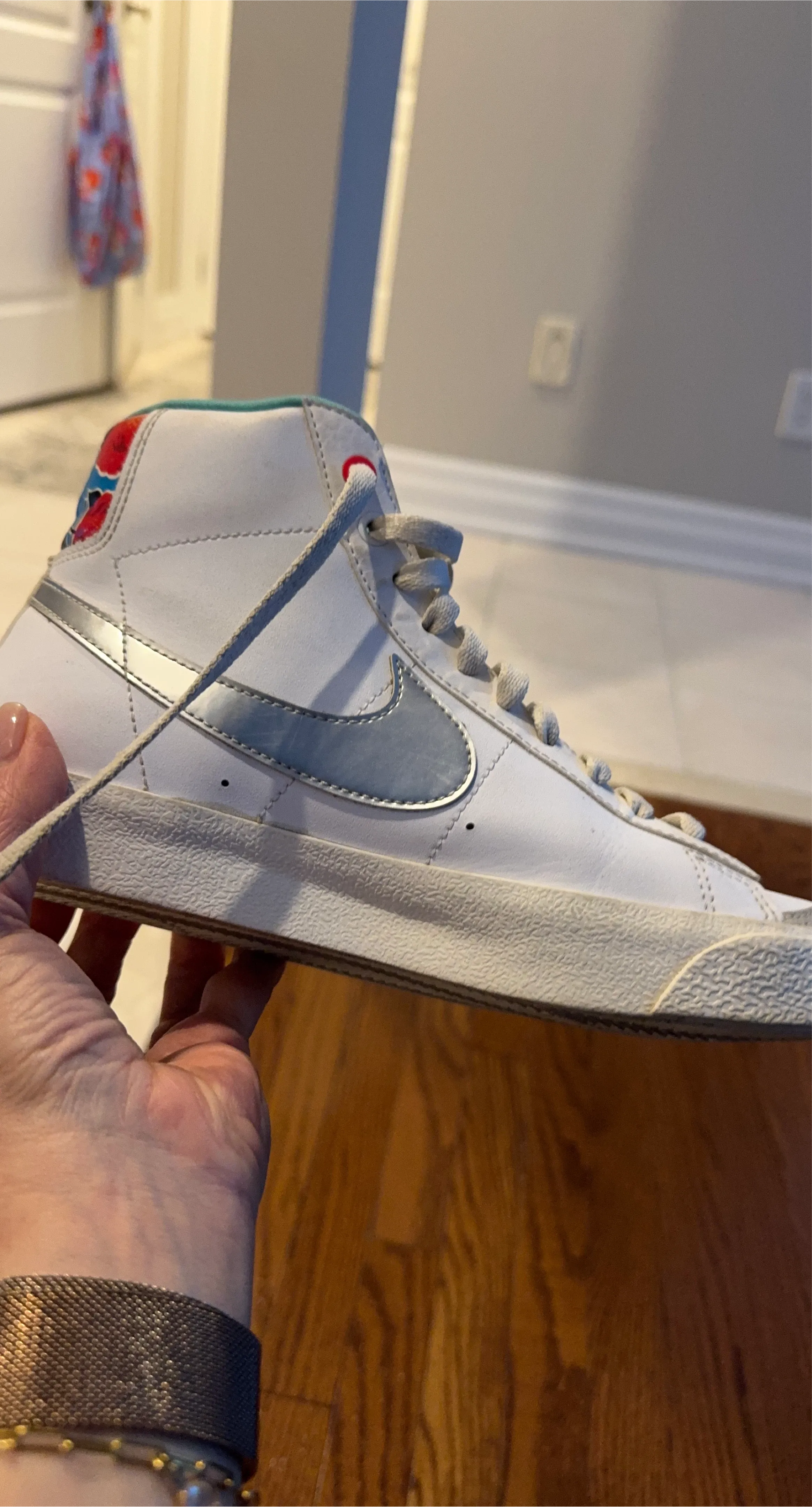 White leather high-top Nike Blazer sneakers. Features a silver swoosh and colourful heel tab. Lace-up closure. Classic vintage style.