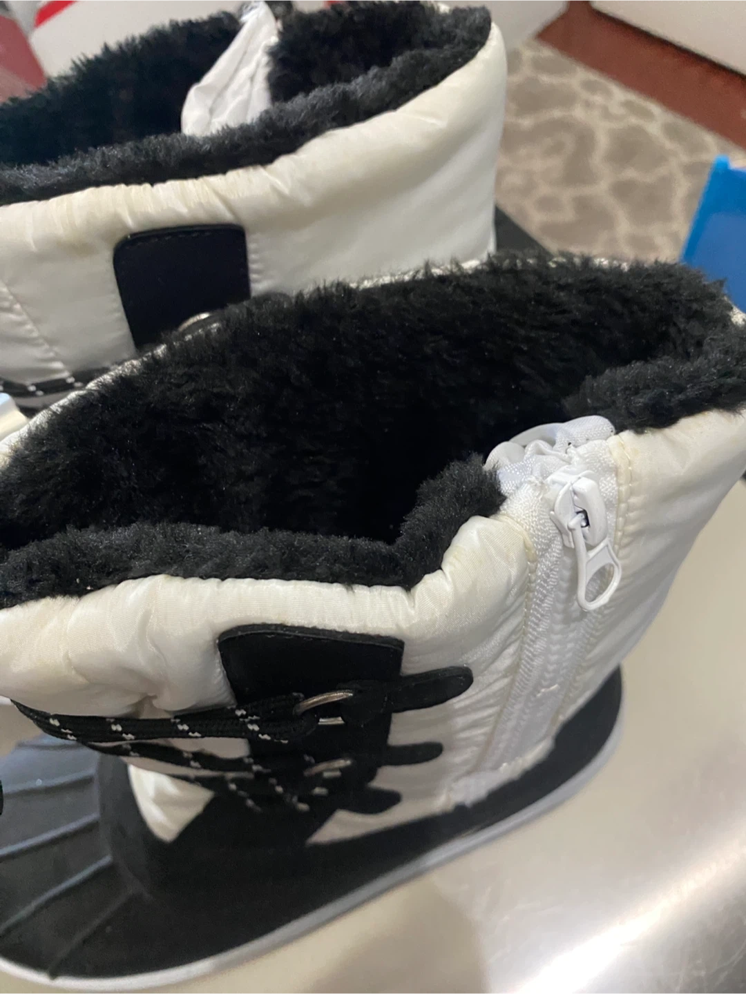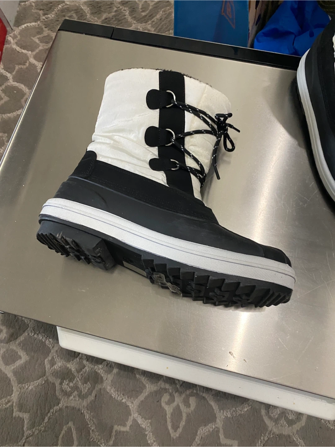 Selling a pair of winter boots in black and white! They are brand new,ready to keep your feet warm this winter. The boots feature a lace-up front with toggle details and a side zipper for easy on and off. The inside is lined with soft black fur. very comfortable and warm.