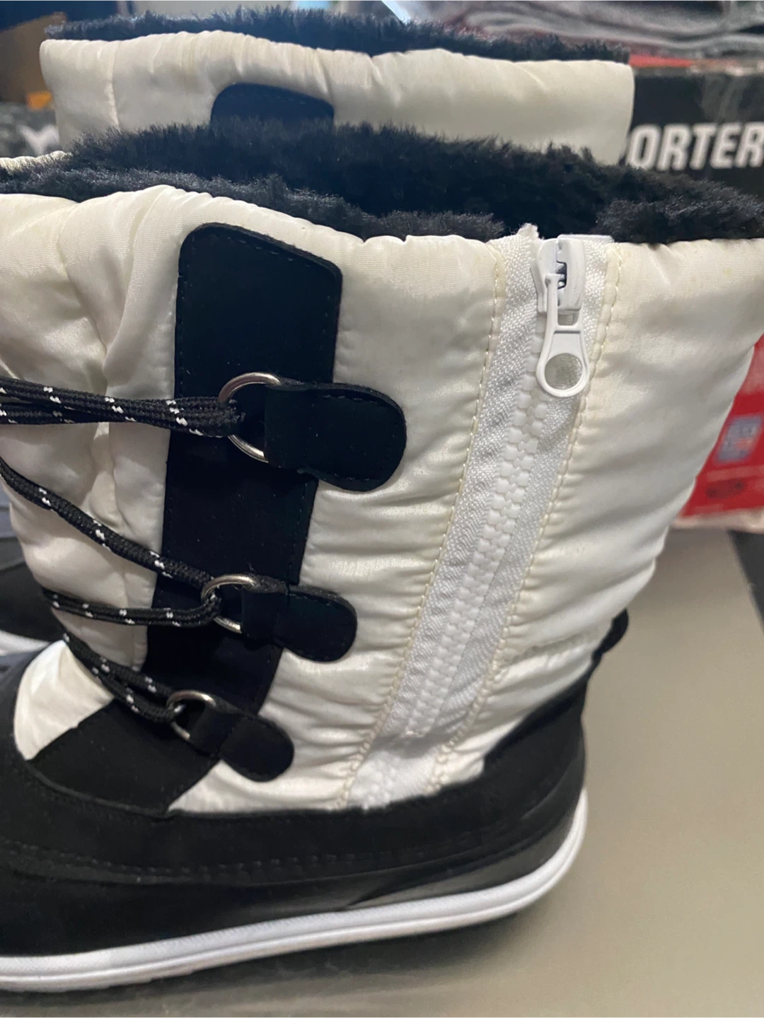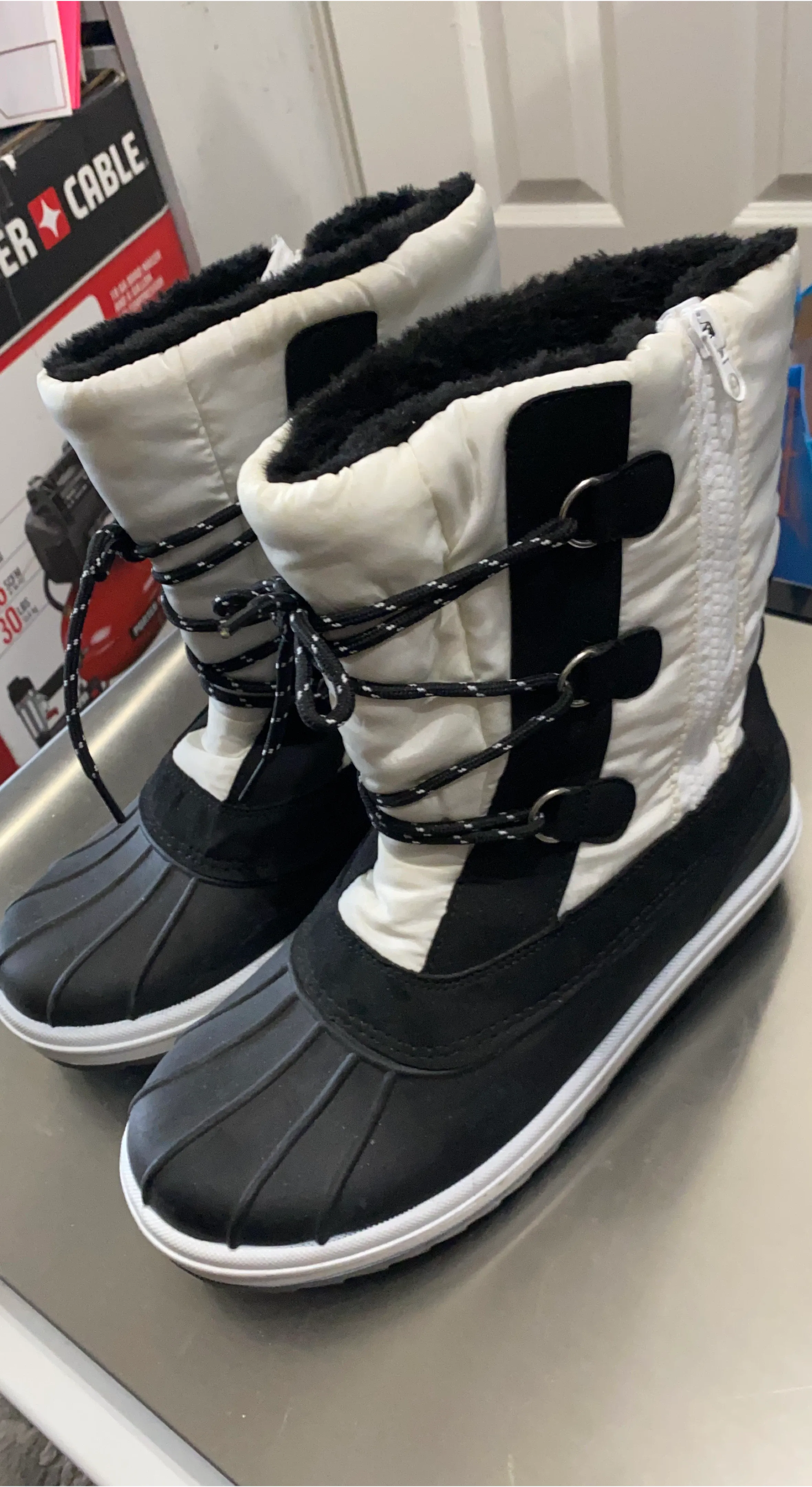 Selling a pair of winter boots in black and white! They are brand new,ready to keep your feet warm this winter. The boots feature a lace-up front with toggle details and a side zipper for easy on and off. The inside is lined with soft black fur. very comfortable and warm.
