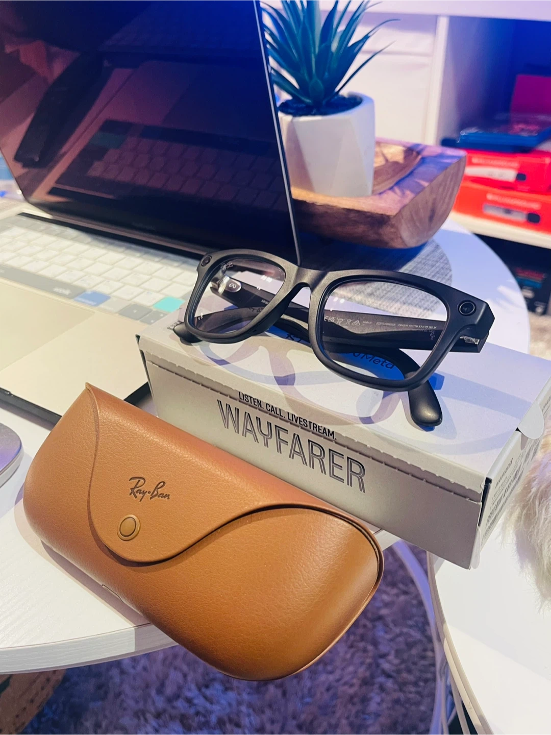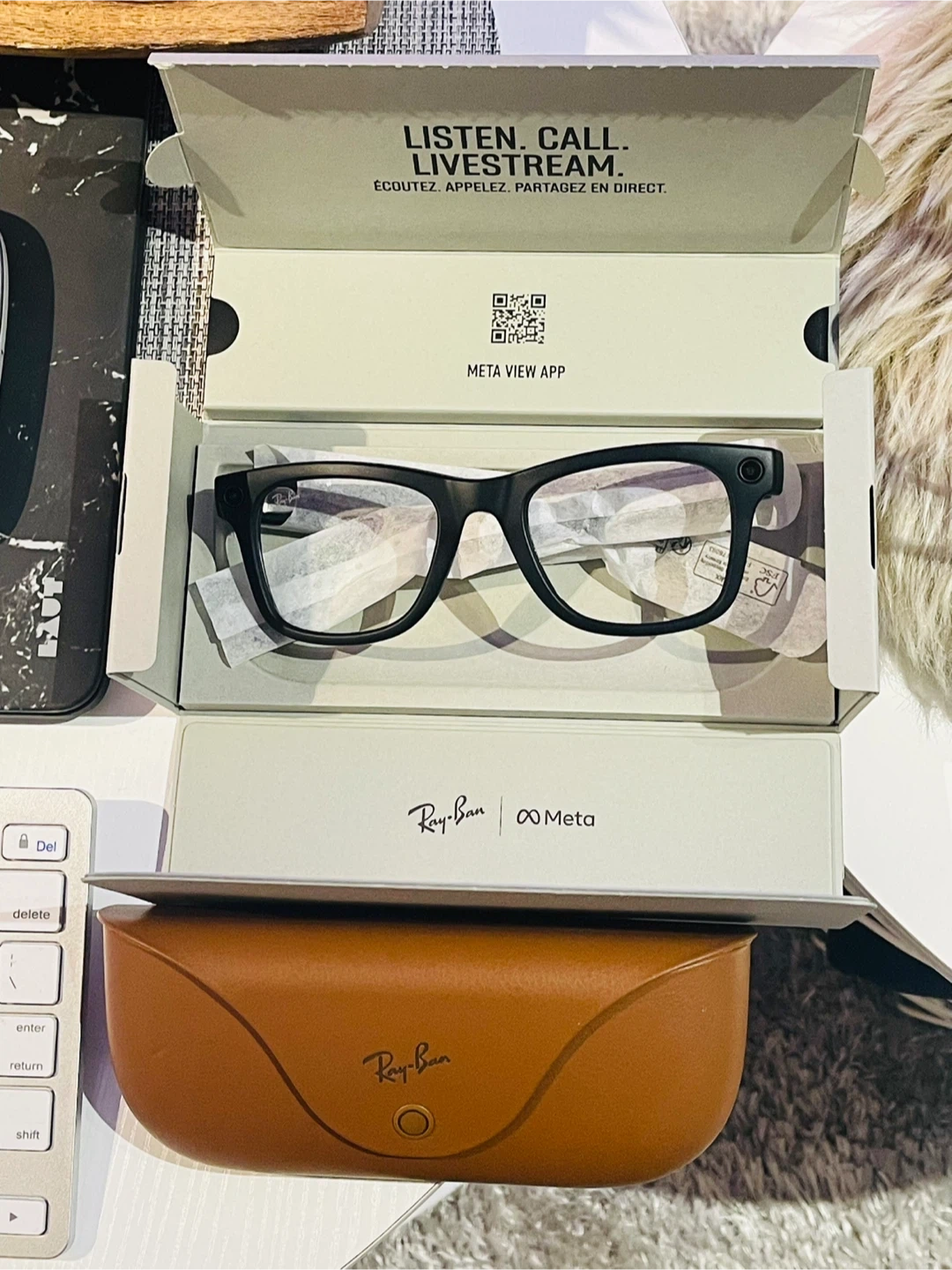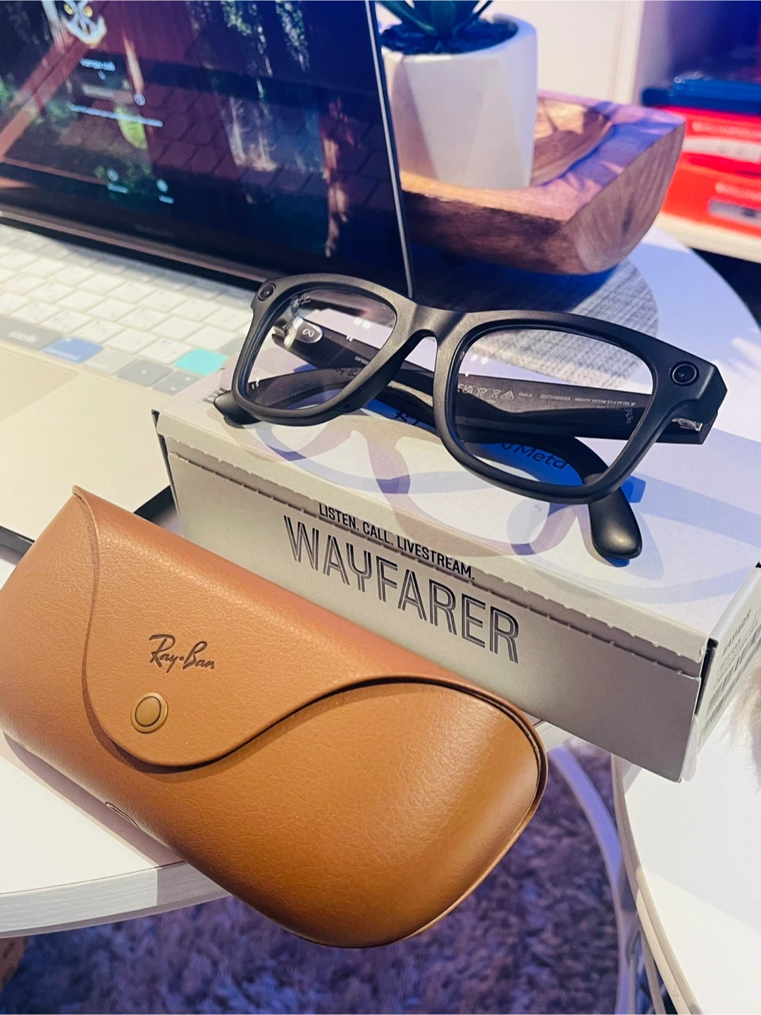 These Ray-Ban Wayfarer smart glasses are a collaboration with Meta. They include built-in audio and camera features for listening, calling, and live streaming. They come with a charging case and a brown leather case.