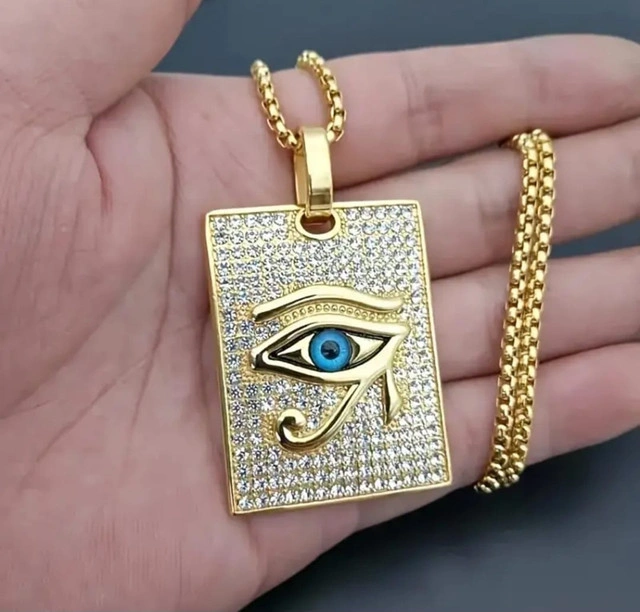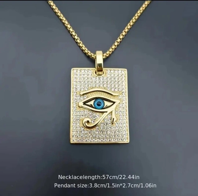 This brand new Eye of Ra necklace features a stunning gold finish with intricate detailing and sparkling accents. The pendant measures approximately 3.8cm x 2.7cm, and the chain is about 57cm long. It’s not just a necklace; it’s a conversation starter. Wear a piece of history and add a touch of pharaoh flair to your everyday look! If the ad's still up, the necklace is ready to go to its new home! Please check out my other listings
