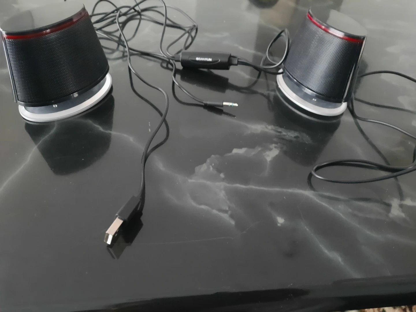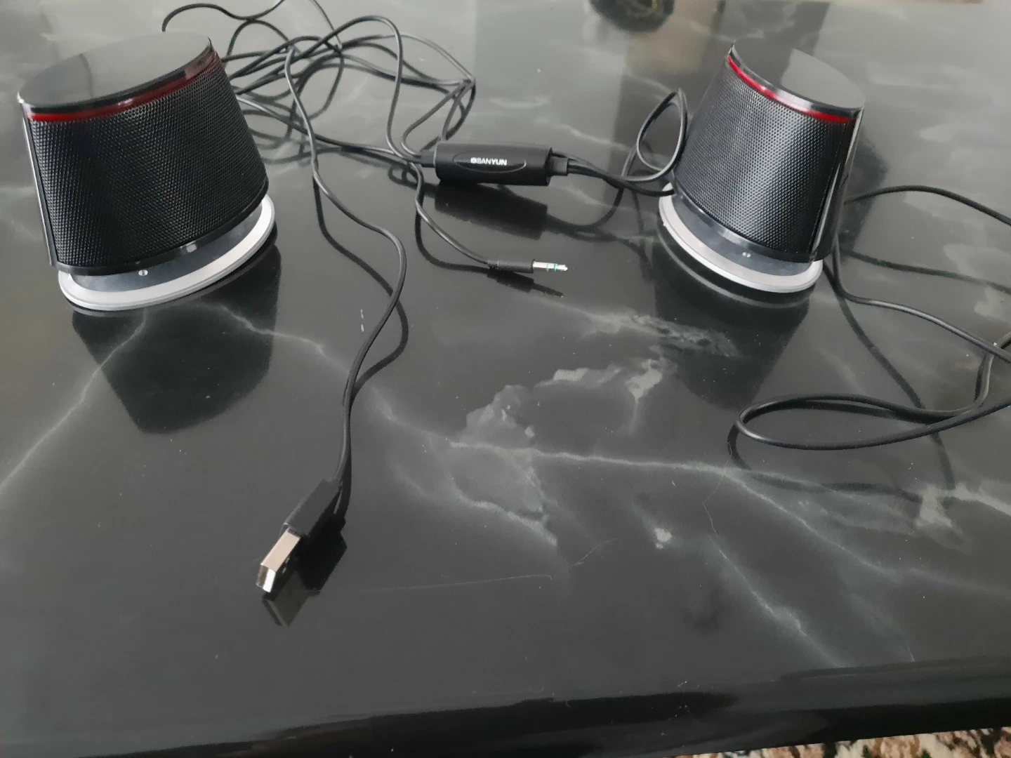 These are a pair of Sanyun USB powered desktop speakers. They connect via USB and a 3.5mm audio jack. Great for a computer setup!