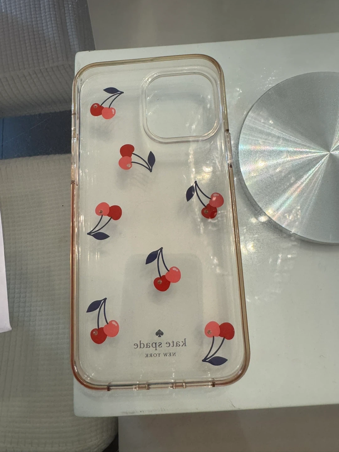 This is a Kate Spade iPhone case featuring a cute cherry print. It's a clear case with a pinkish tint on the sides and a playful cherry design with small rhinestones. It's designed for a specific iPhone model, likely offering good protection for Iphone 13 Pro Max. Pick up at Steeles & Bathurst area.