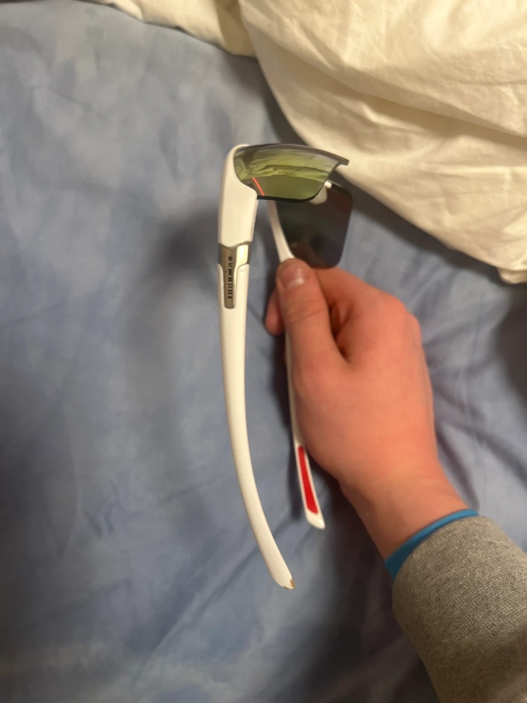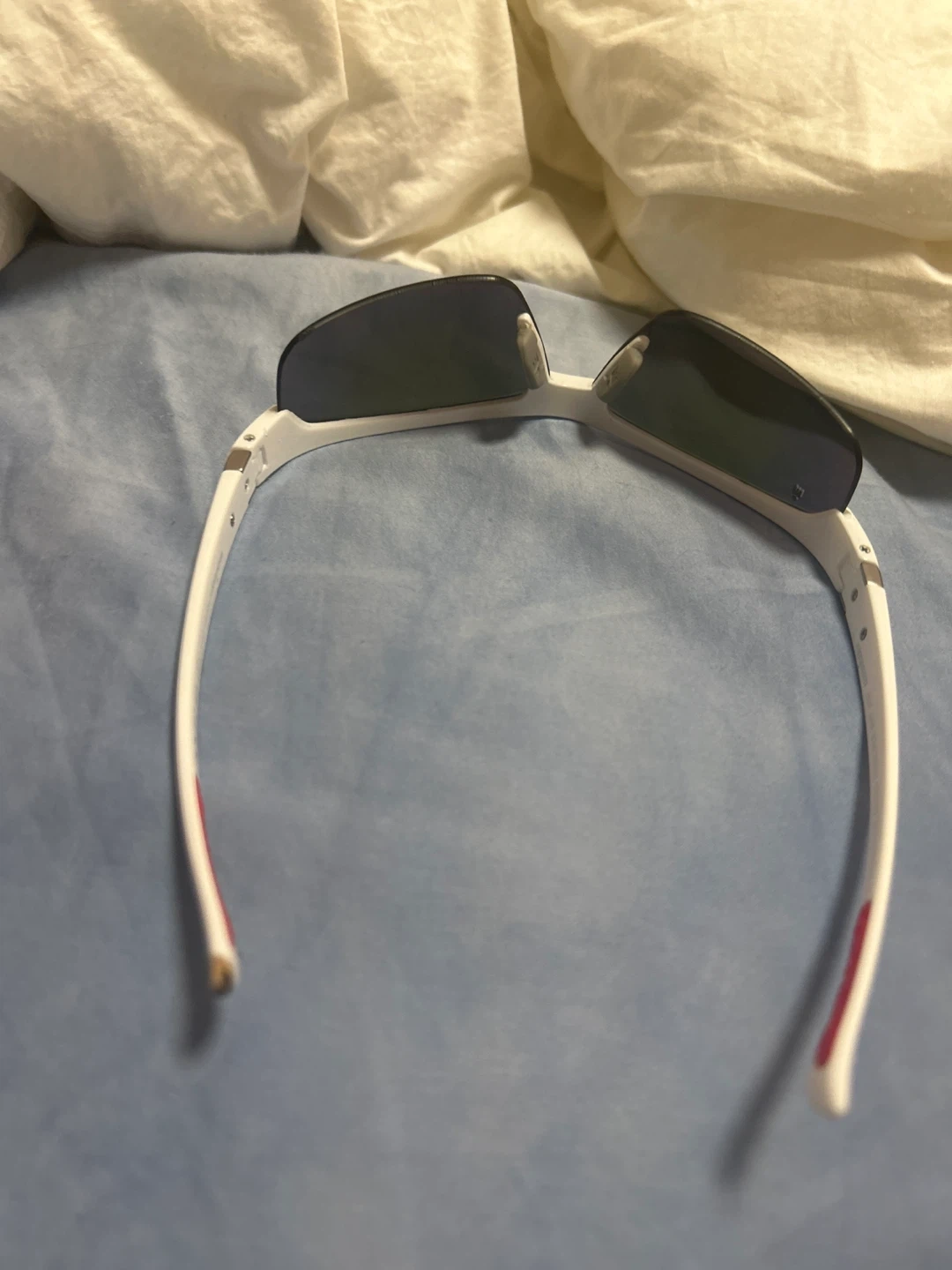 White Ironman sports sunglasses with tinted lenses. These shades offer a comfortable fit for active wear. Red accents on the arms add a sporty touch.