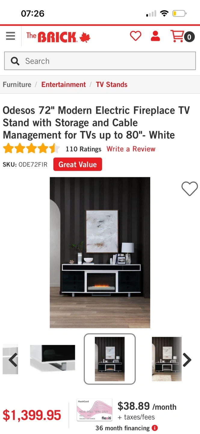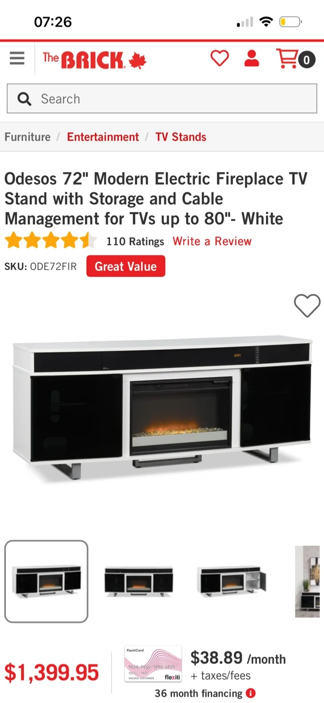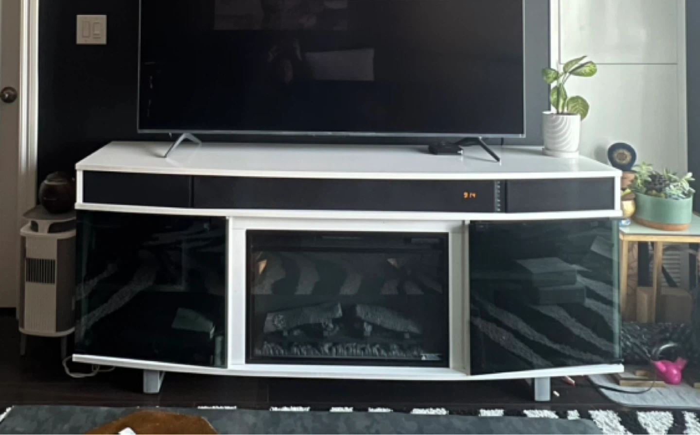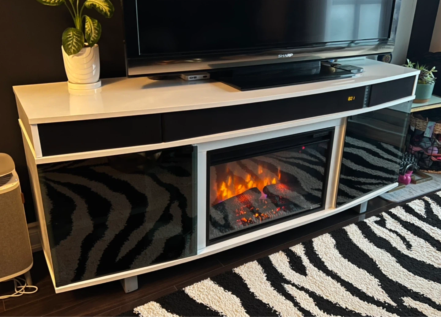 This stylish white media console features a built-in electric fireplace with realistic flames. It has tempered glass doors with a black zebra print design, offering ample storage space. This unit provides a cozy ambiance and a convenient place for your TV and media equipment.