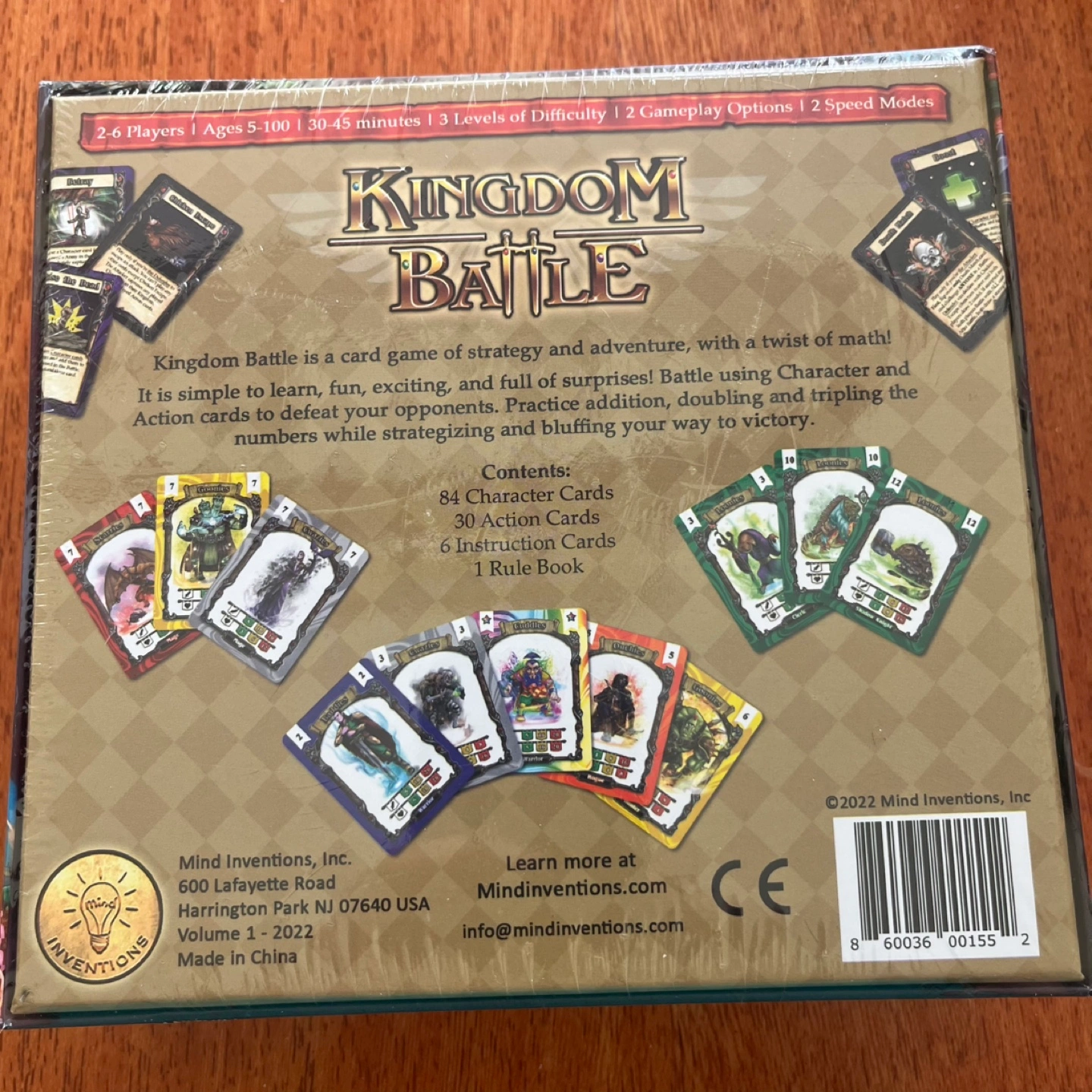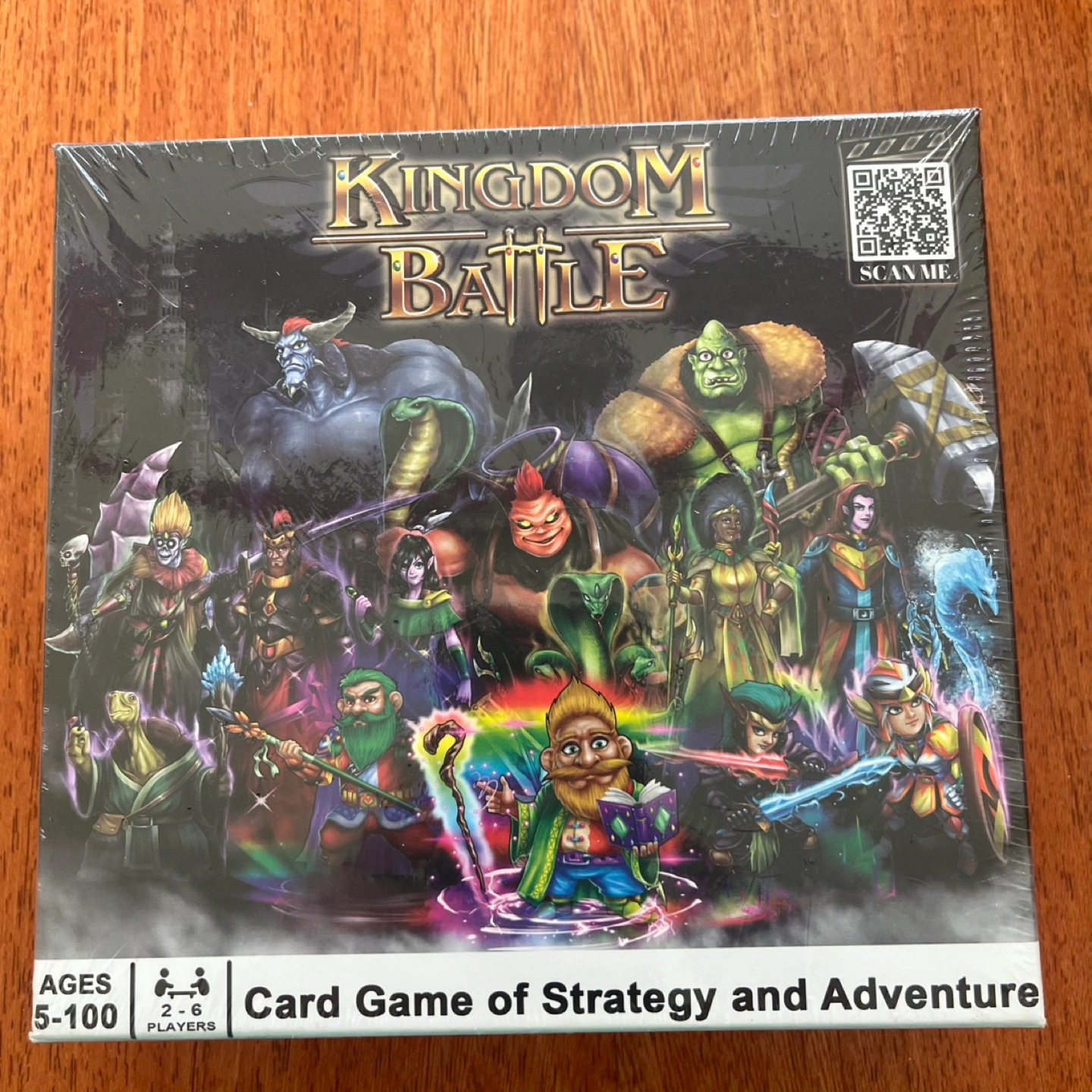 NEW Kingdom Battle card game. Ages 5-100, 2-6 players. Still in package. Strategy and adventure. Includes 84 character cards, 30 action cards, 6 instruction cards, and a rule book. Fun, exciting, and full of surprises! Math involved.