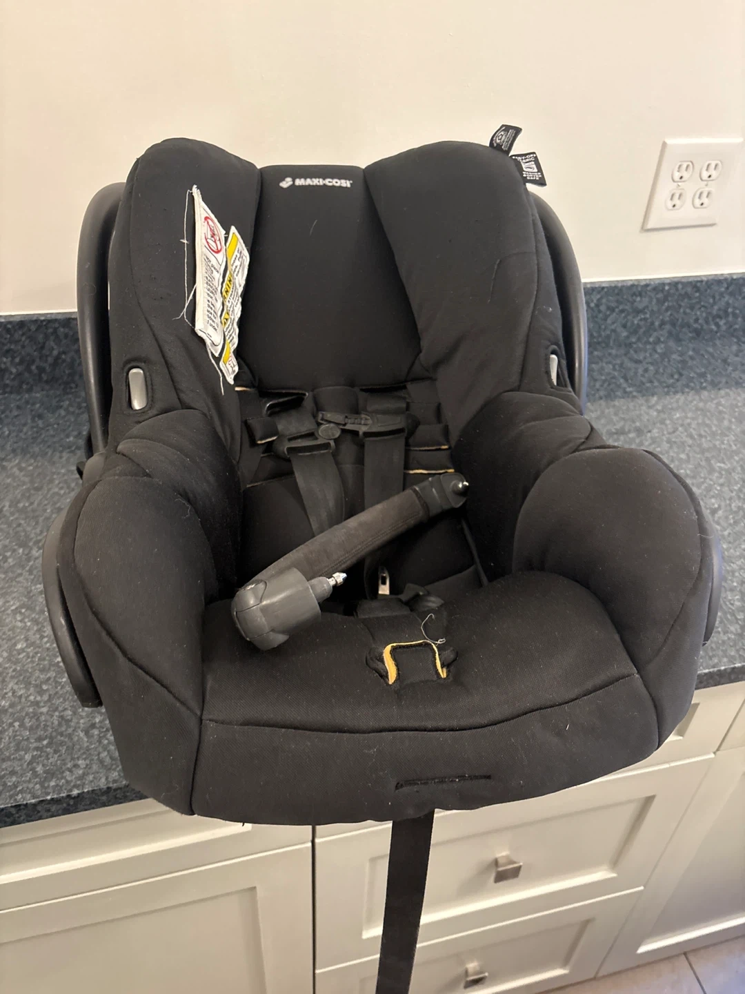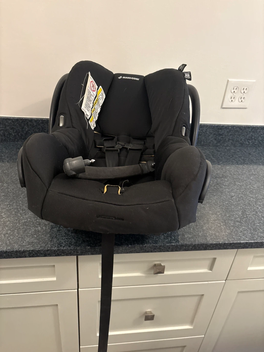 This is a black Maxi-Cosi infant car seat. It has a 5-point harness for safety. The seat is made of fabric and plastic.