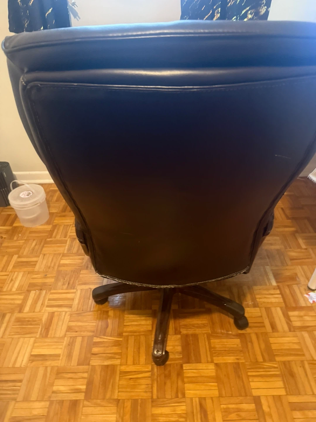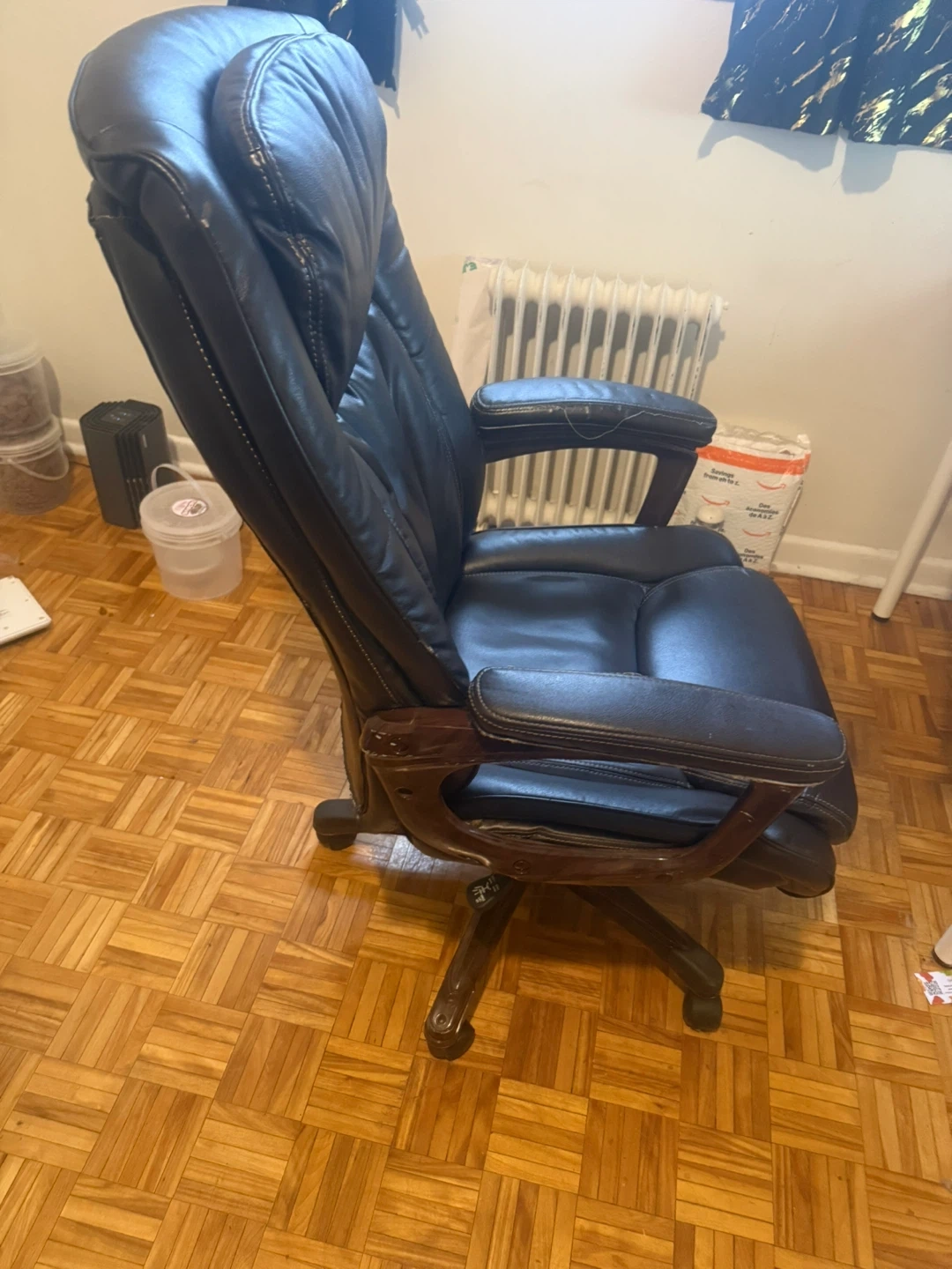 This is a black faux leather executive office chair. It features a high back and padded armrests for comfort. The chair has a swivel base with casters for easy mobility. It's suitable for a home office or workspace and has some scratches on it