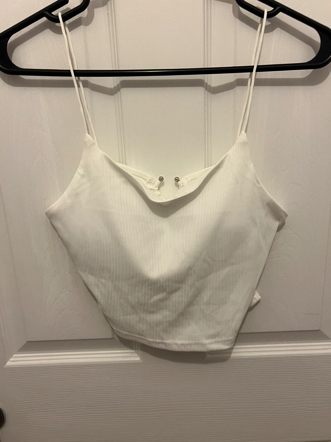 White ribbed tank top with a cut-out detail in the front and subtle metal clasp closure. Thin spaghetti straps. Material is a stretchy knit fabric.