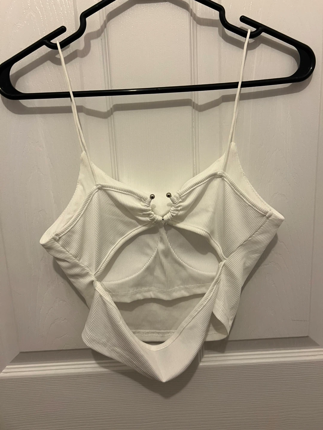 White ribbed tank top with a cut-out detail in the front and subtle metal clasp closure. Thin spaghetti straps. Material is a stretchy knit fabric.