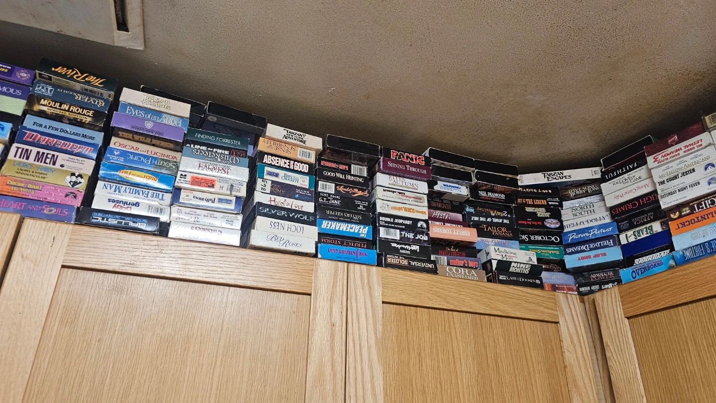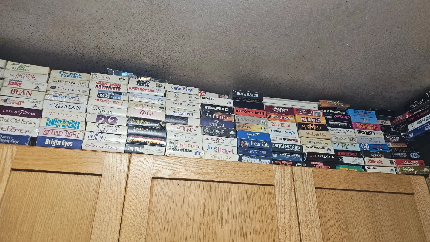 A large collection of VHS tapes featuring a variety of movies. Includes classics, family films, and action genres. Perfect for collectors or those looking to enjoy retro movie nights. These are all pre-recorded tapes.
