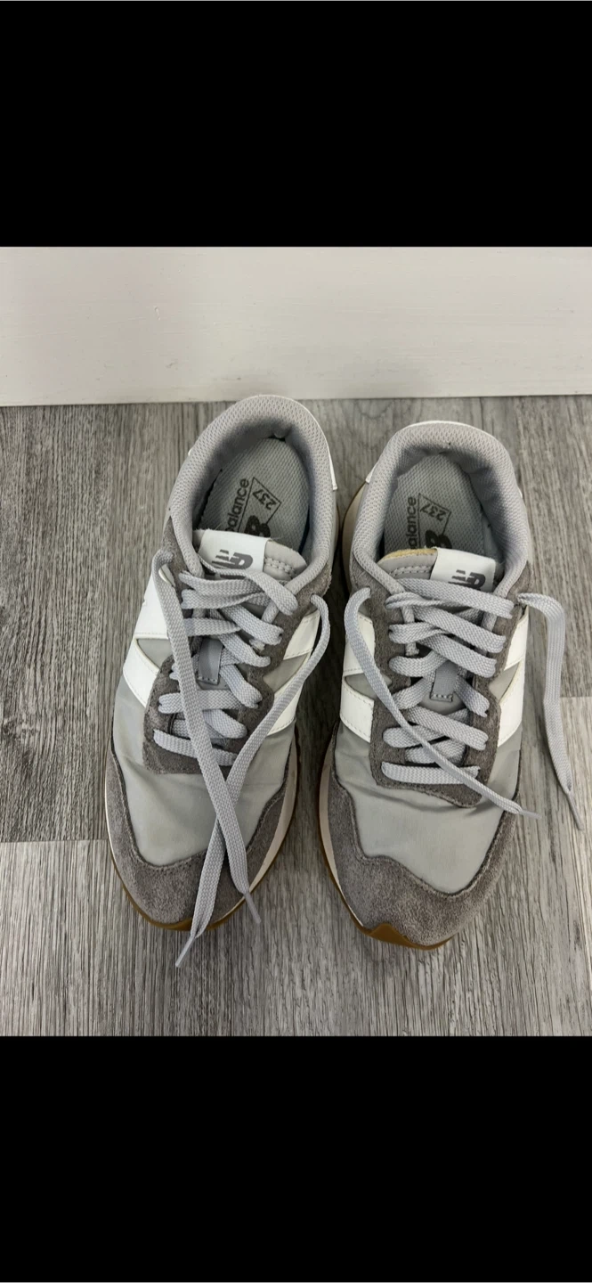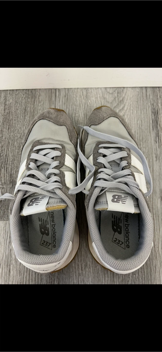 These New Balance 237 sneakers are grey and white. They have a suede and mesh upper. The rubber outsole provides good grip.