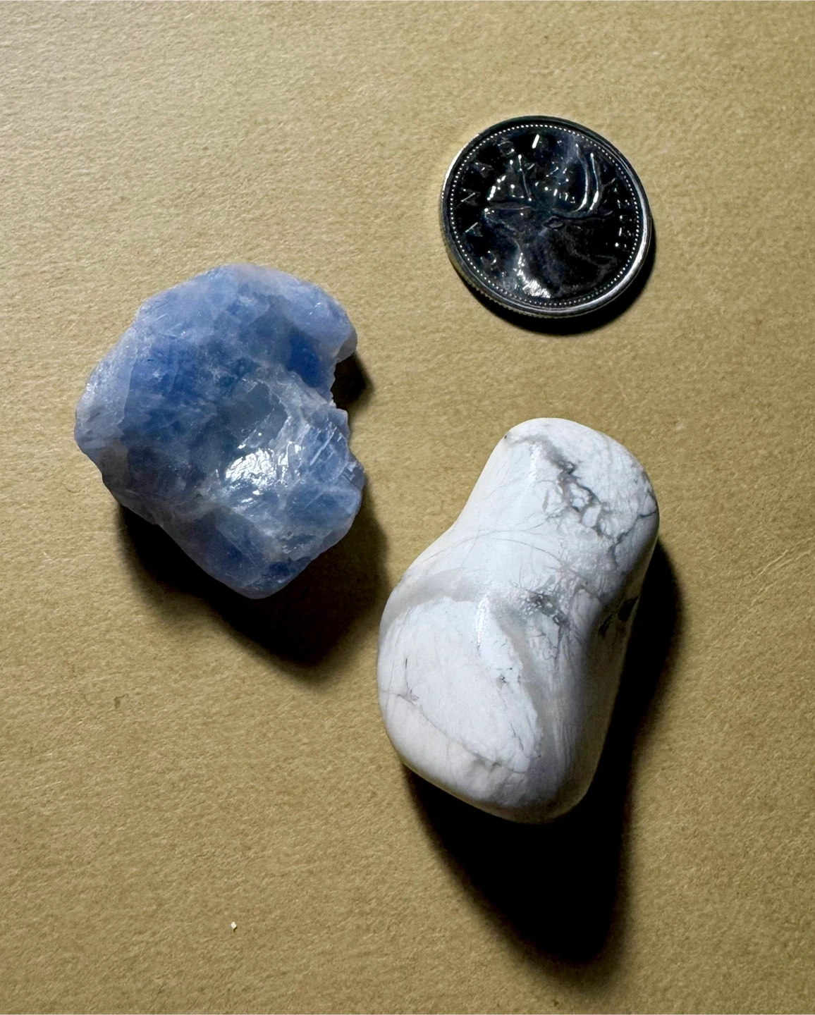 Two natural crystal chunks, one a vibrant blue calcite and the other a marbled white howlite. Great for home decor or spiritual healing!