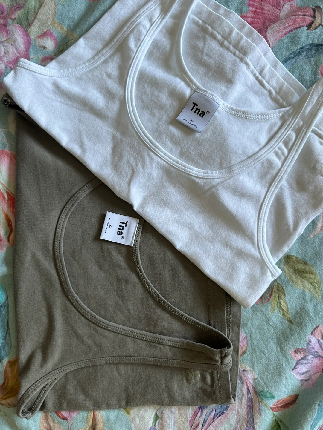 Two tank tops. White and olive-green colour. Tank tops are both size XS. A comfortable set of tops for many outfit combinations, perfect for warm weather.