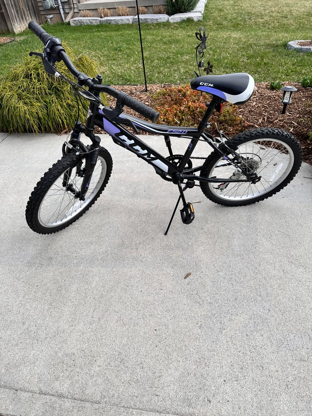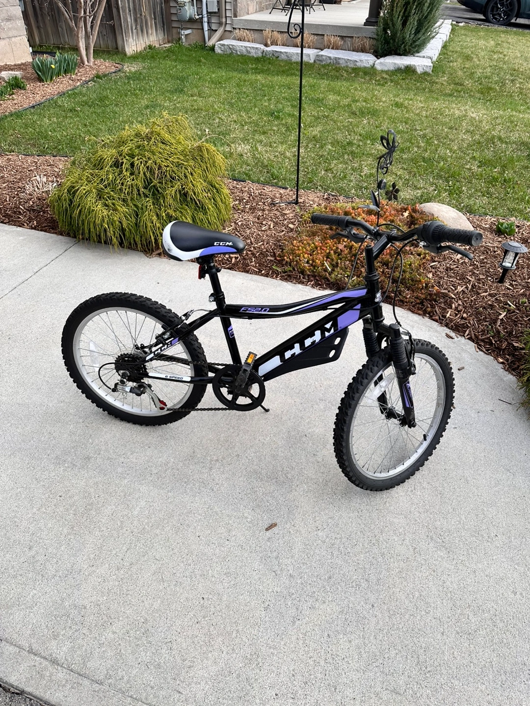 Used CCM girls' bicycle. 20 inch wheels. Black and purple frame. Front suspension forks. Hand brakes. Good condition.