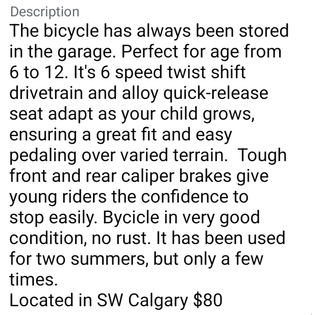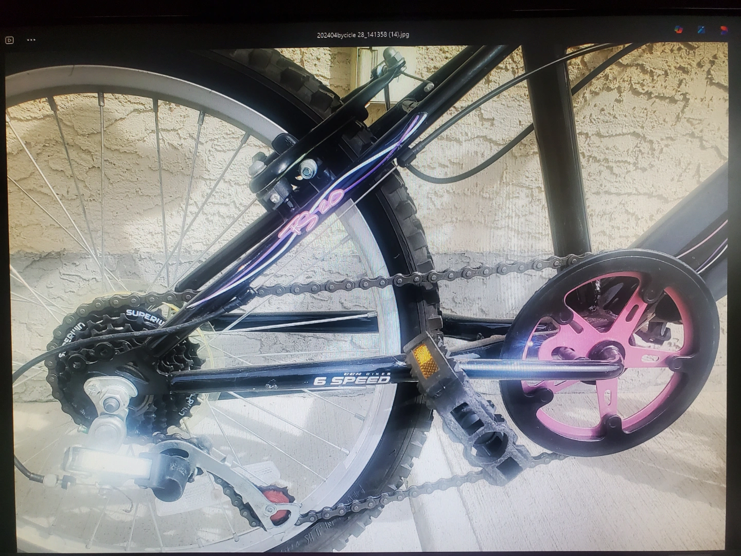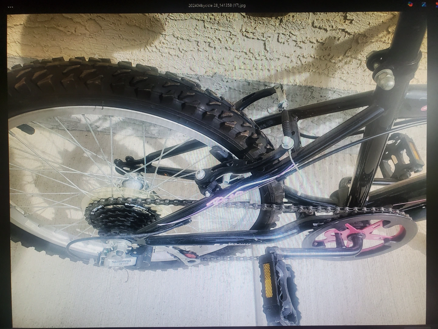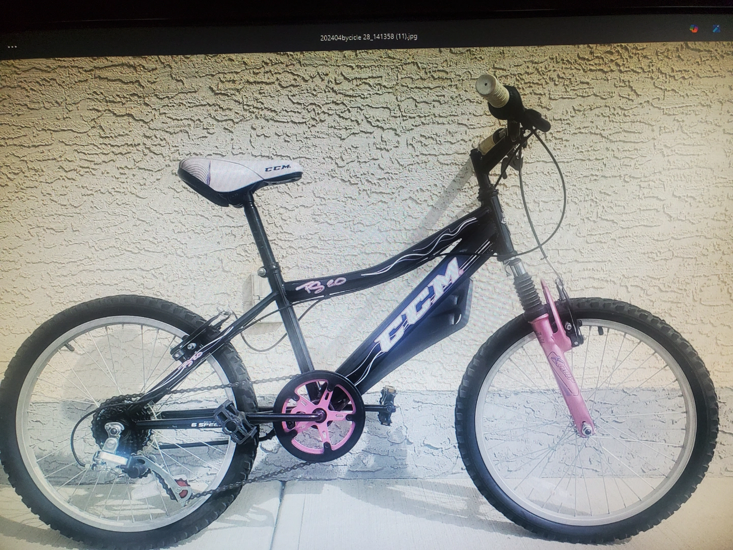 Girls' bike, 6-speed twist shift drivetrain. Alloy quick-release seat. Tough front and rear caliper brakes. Good condition, used only a few times. Suitable for ages 6-12.