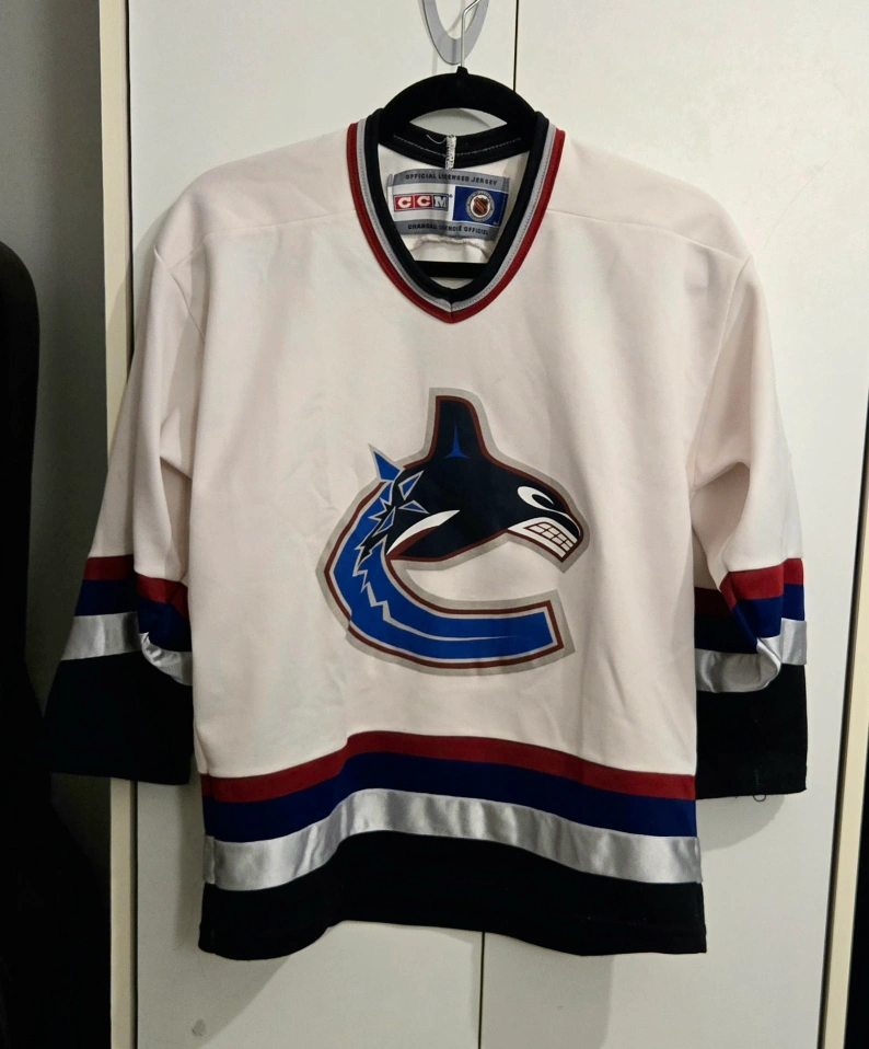Selling a CCM Vancouver Canucks hockey jersey. It features the classic Orca logo and team colours. Excellent condition. Size adult small. Can also fit Youth Lg or XL