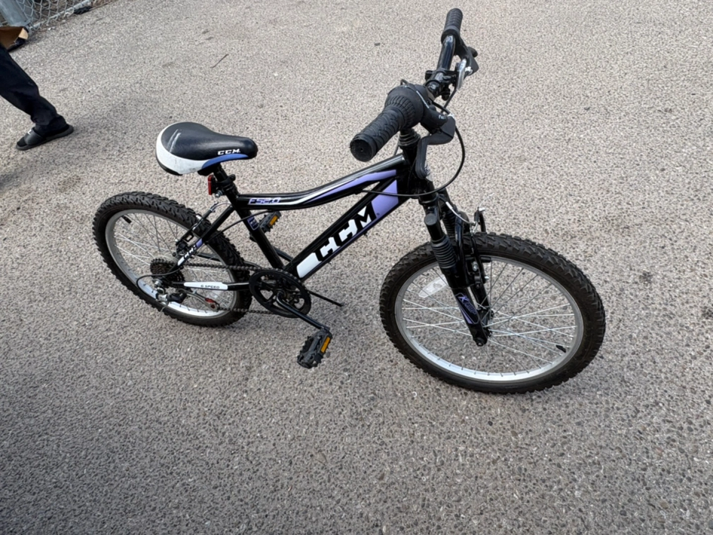 Black and purple bike. Features a white and black seat. Has black handles. Designed for a comfortable and relaxing ride.