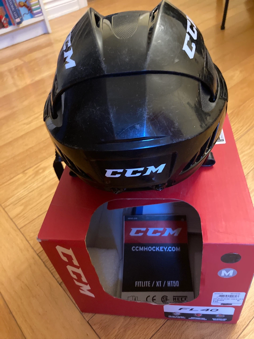 933Selling a CCM hockey helmet in black, size medium children’s. It comes with the original box. Perfect for hitting the ice! Used but not in damaged or worn out condition.
