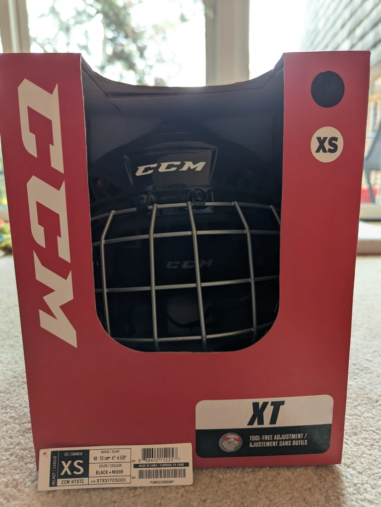 Selling a CCM HTXTC hockey helmet in size XS. It's black and has tool-free adjustment. The size range is 48-53 cm or 6" - 6 5/8". it has been worn only once and is in perfect shape.