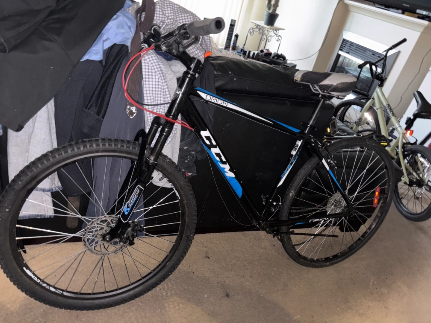 Selling a CCM Orion 21 speed Men’s XL MTB. It's a Beast! It’s got front end Shocks with a 26” Brand new knobby tire and a 27.5” New back road tire it’s in Great condition and Absolutely Lightening Fast it’s black with blue accents. Good for getting around town! BRAND SPANKING NEW DERAILLEUR ITS ALSO GOT THE UPGRADED TWIST ON CASSETTE WITH BRAND NEW CASSETTE EASY REMOVAL ON A 27.5” REAR WHEEL