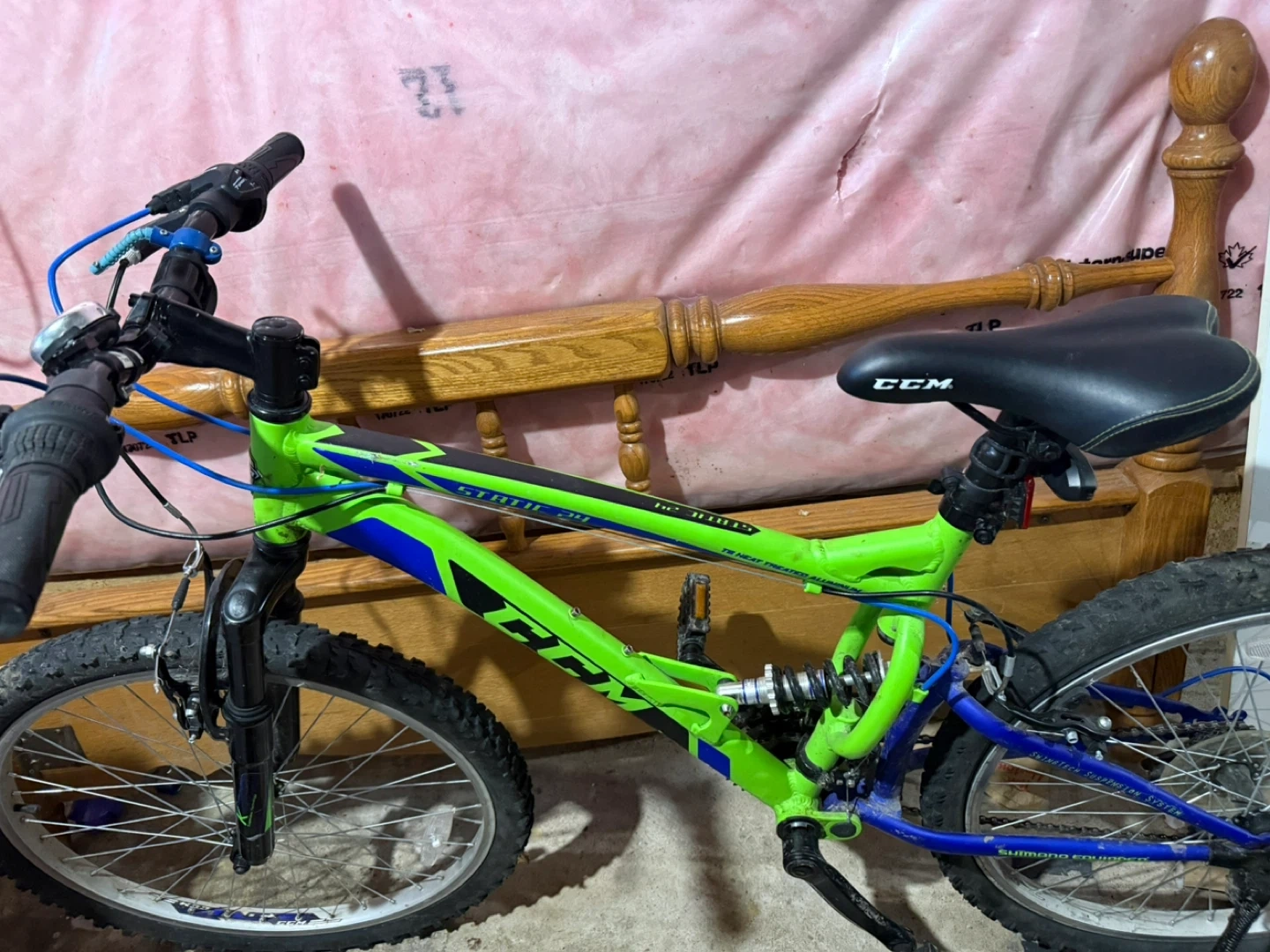 Selling a CCM Static 24" mountain bike in green and blue! It's got a sturdy frame and would be great for hitting the trails or just cruising around the neighbourhood. It has a SwissTech Suspension System and Shimano equipped gears.