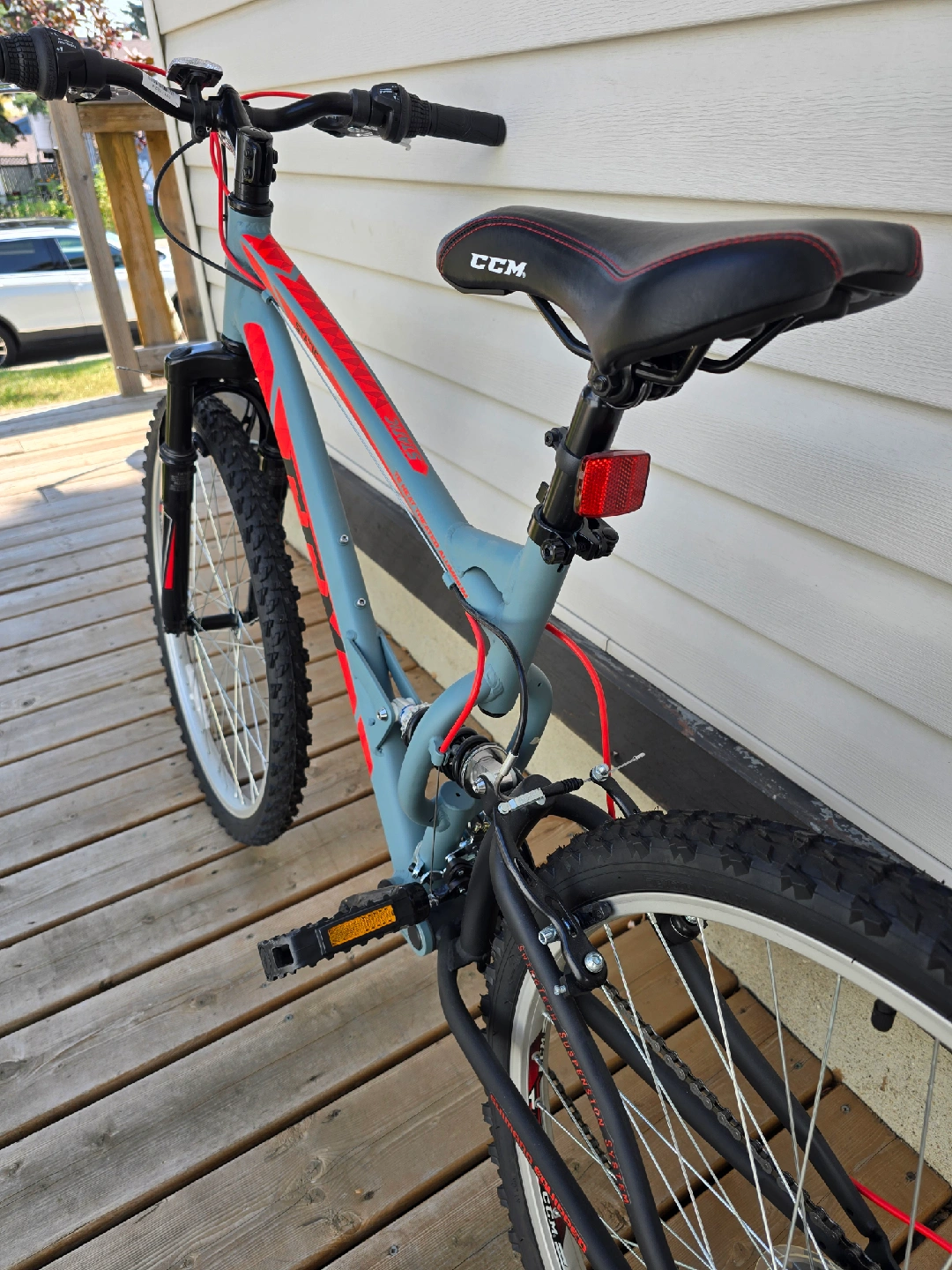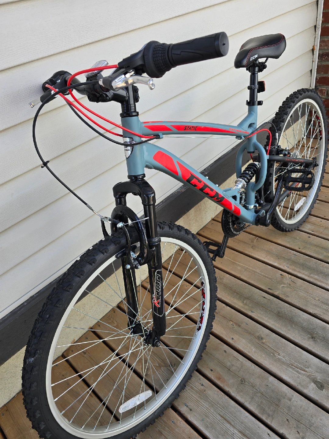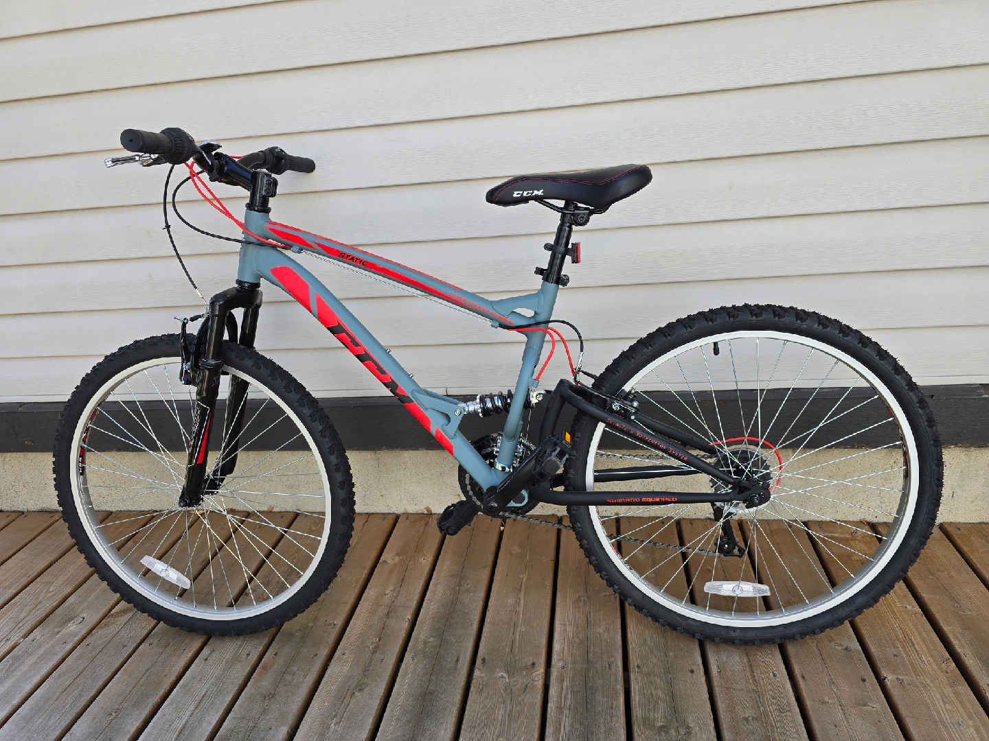 Selling a CCM Static mountain bike in grey and red. It's in excellent condition and ready for some trails or city riding! The bike has a comfortable seat and sturdy frame for a smooth ride