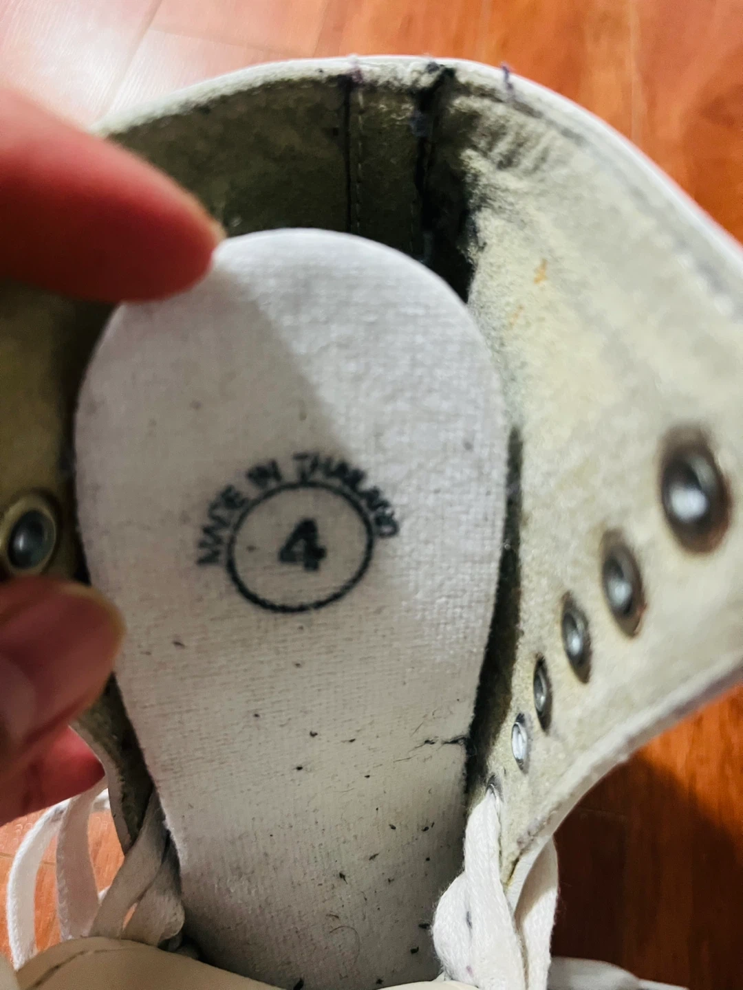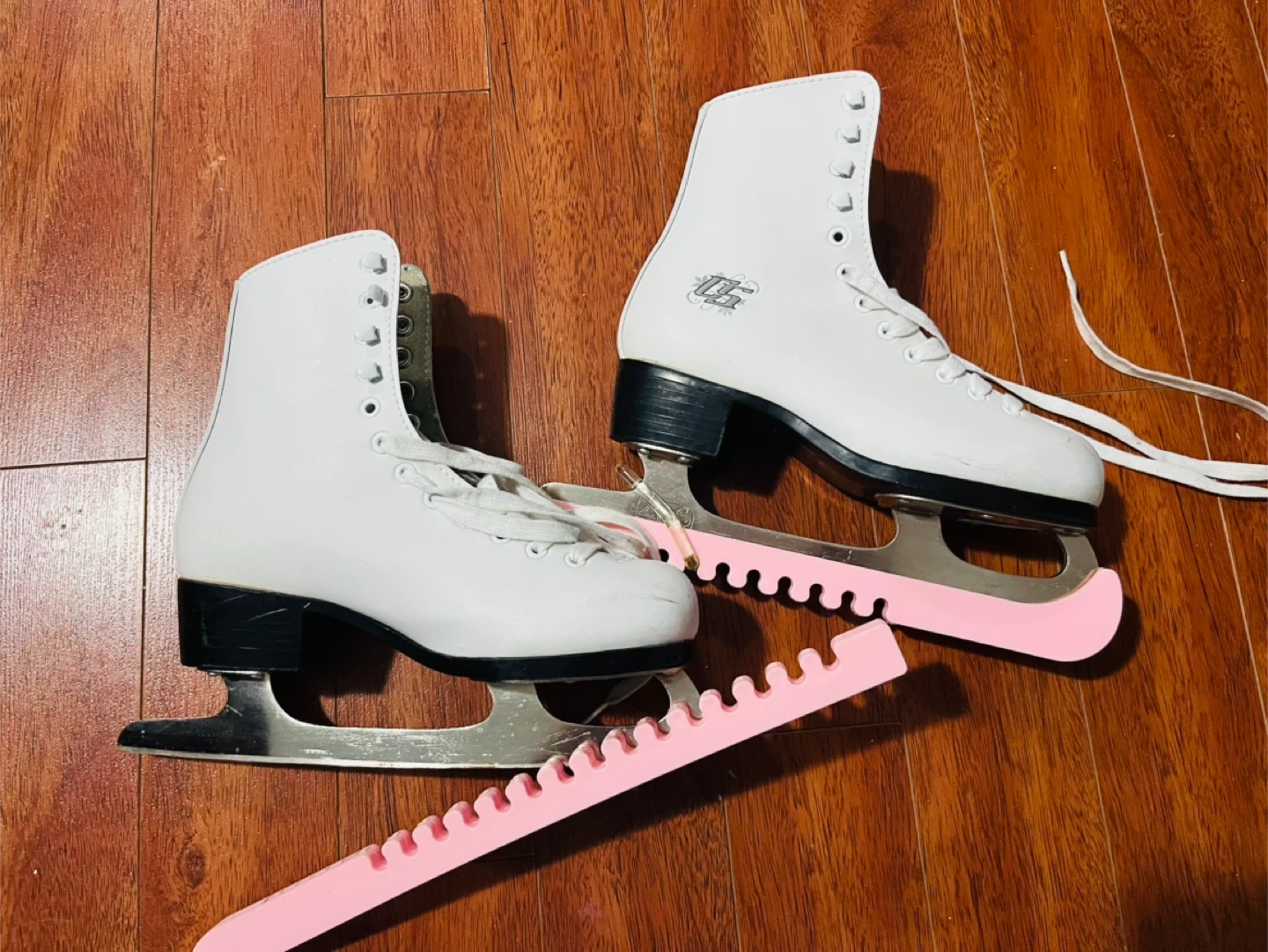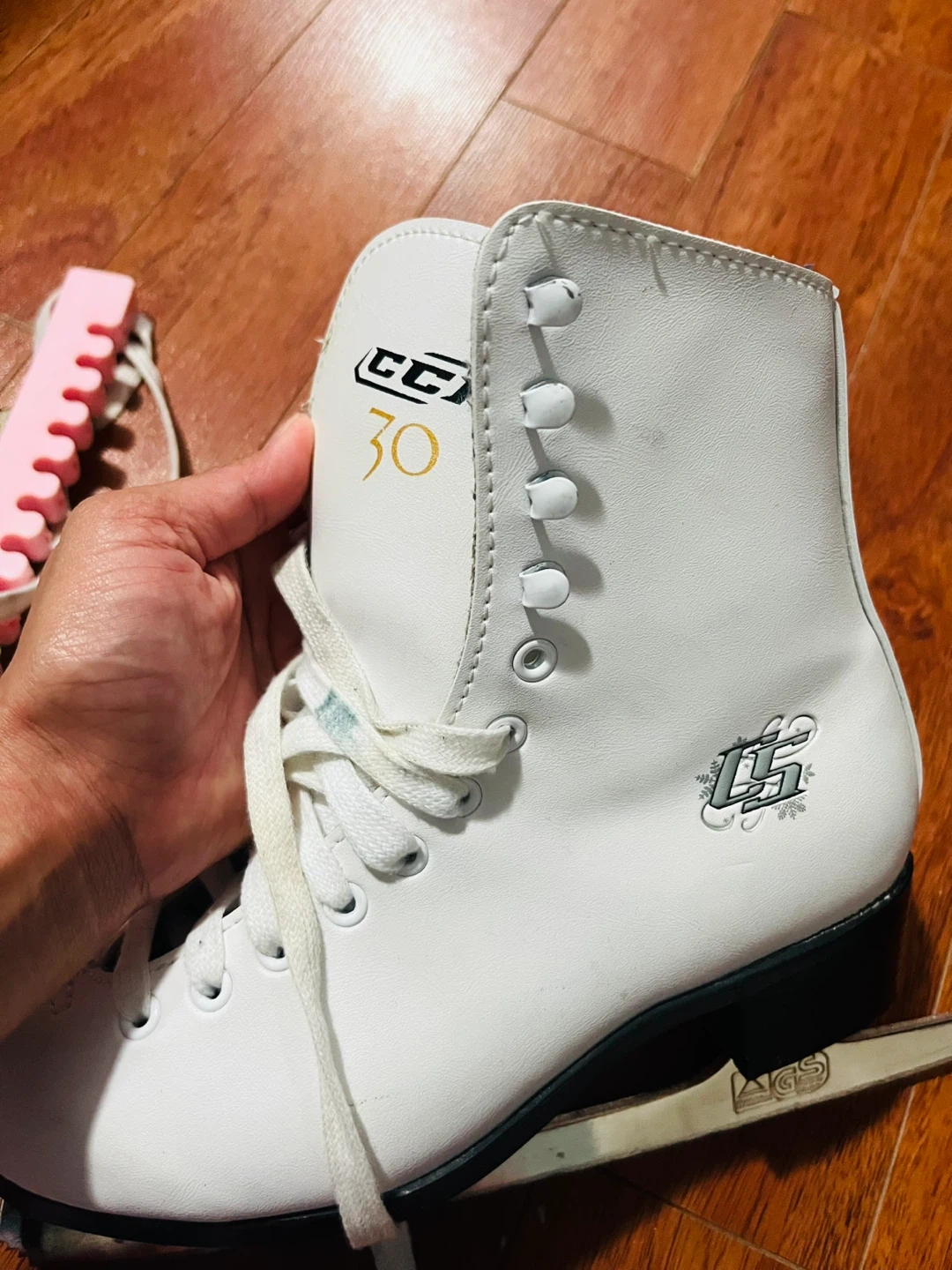 223Selling a pair of CCM figure skates in white with blade protector. They are a size 4. Great for recreational skating or learning new skills at the rink!