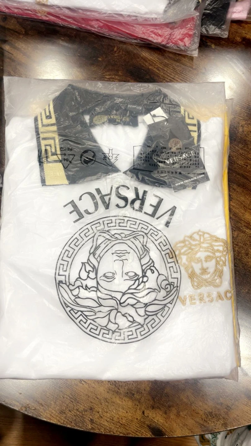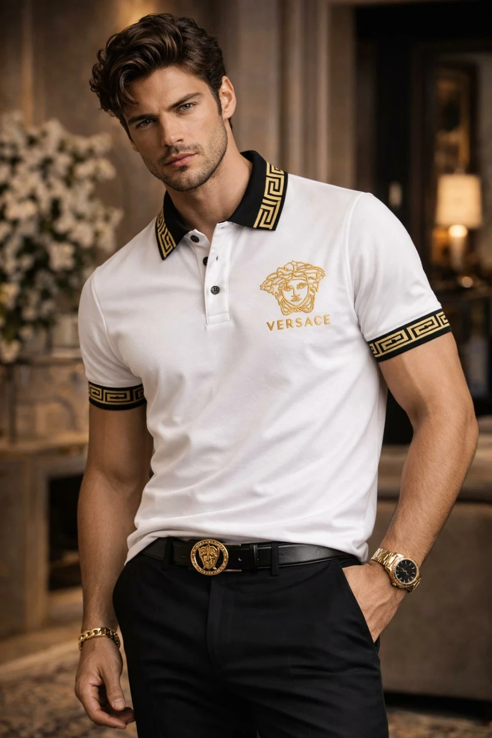 This is a white Versace polo shirt with gold Medusa and Greek key accents on the collar and sleeves. It features a classic two-button placket. The material is a comfortable cotton blend, perfect for everyday wear.