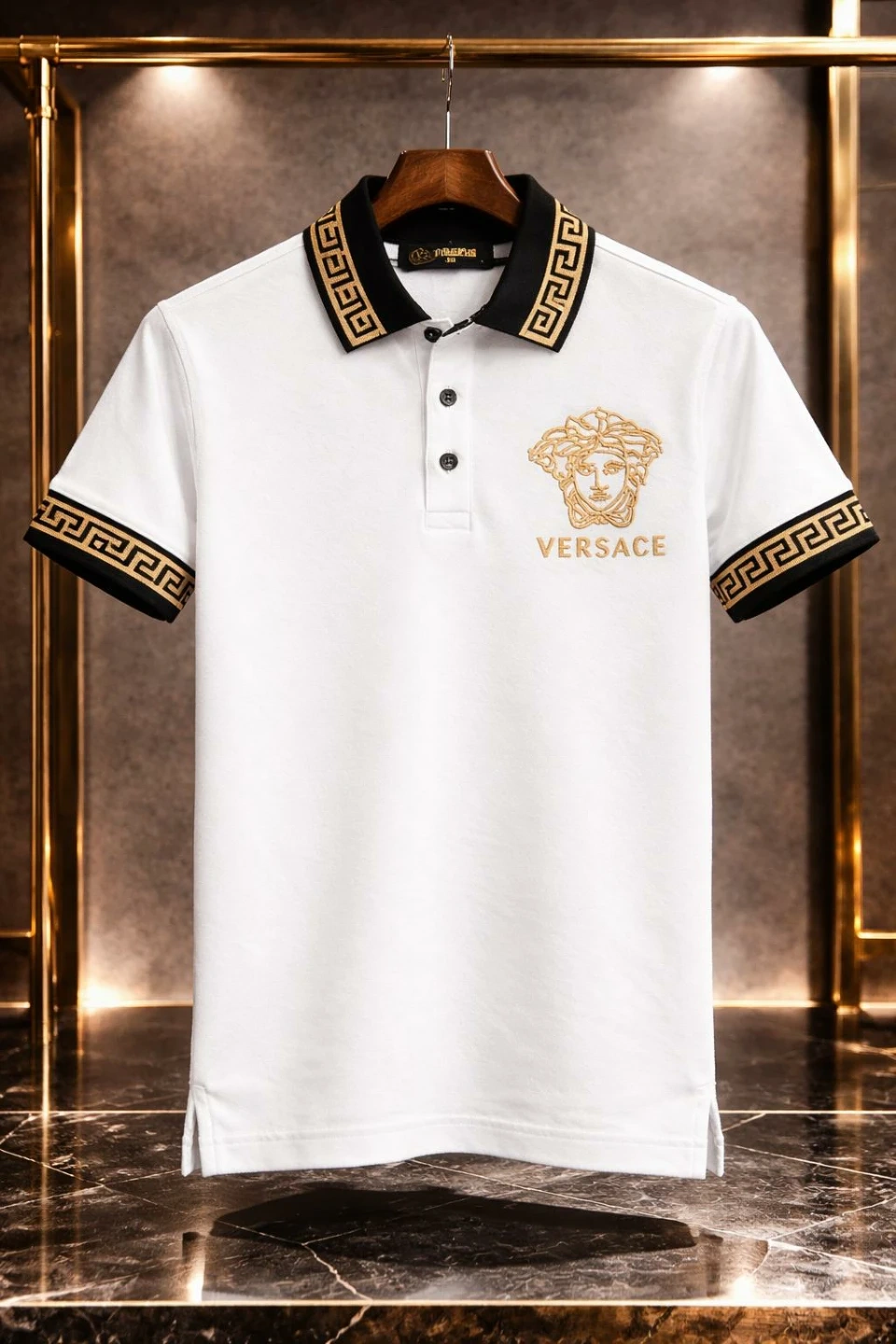 This is a white Versace polo shirt with gold Medusa and Greek key accents on the collar and sleeves. It features a classic two-button placket. The material is a comfortable cotton blend, perfect for everyday wear.